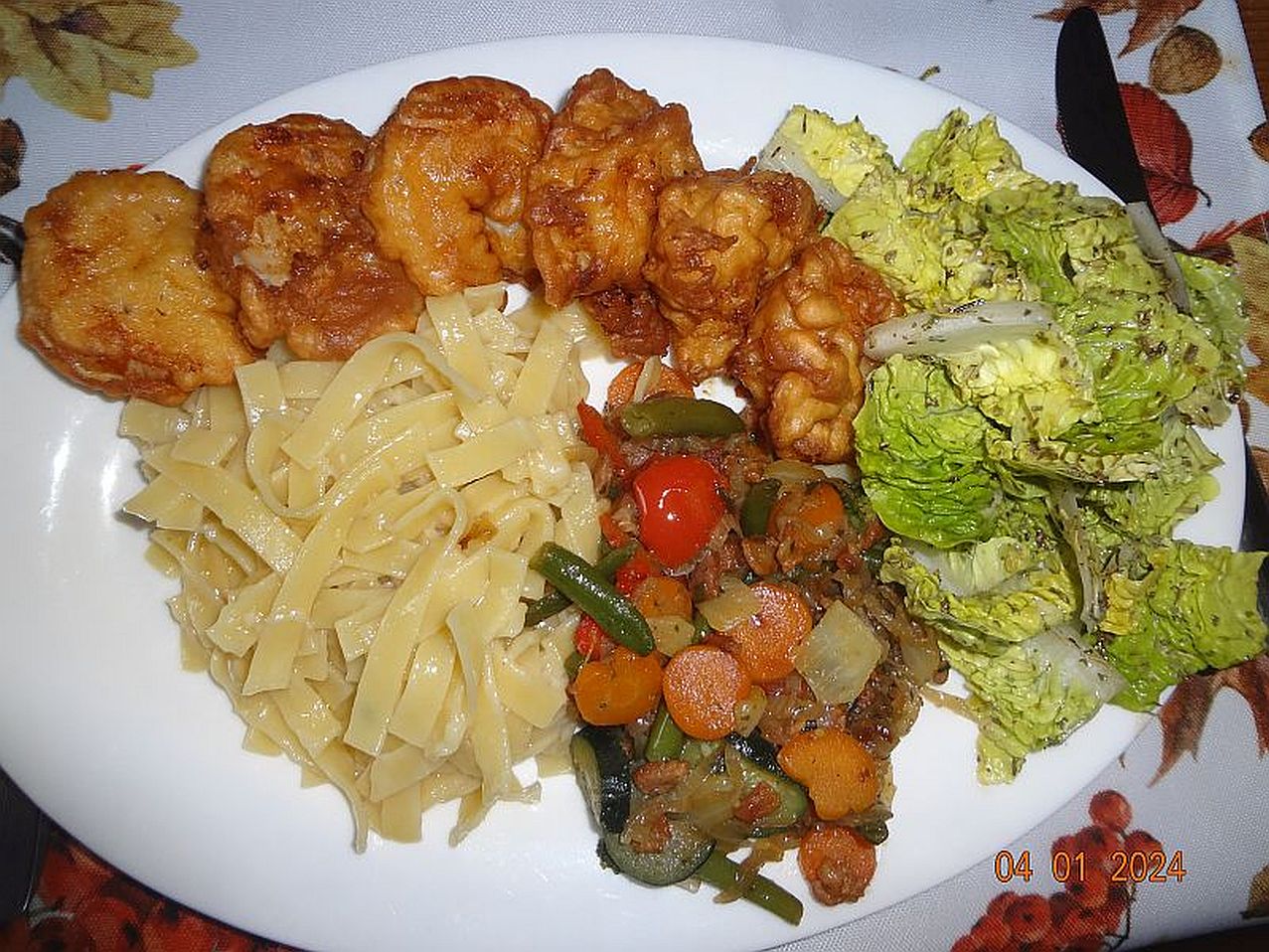 Garnelen im Schlafrock(*), in Rinderbrühe gegarte Käse-Tagliatelle, italienische Gemüse-Pfanne, Salatherzen mit Kräutern der Provence |