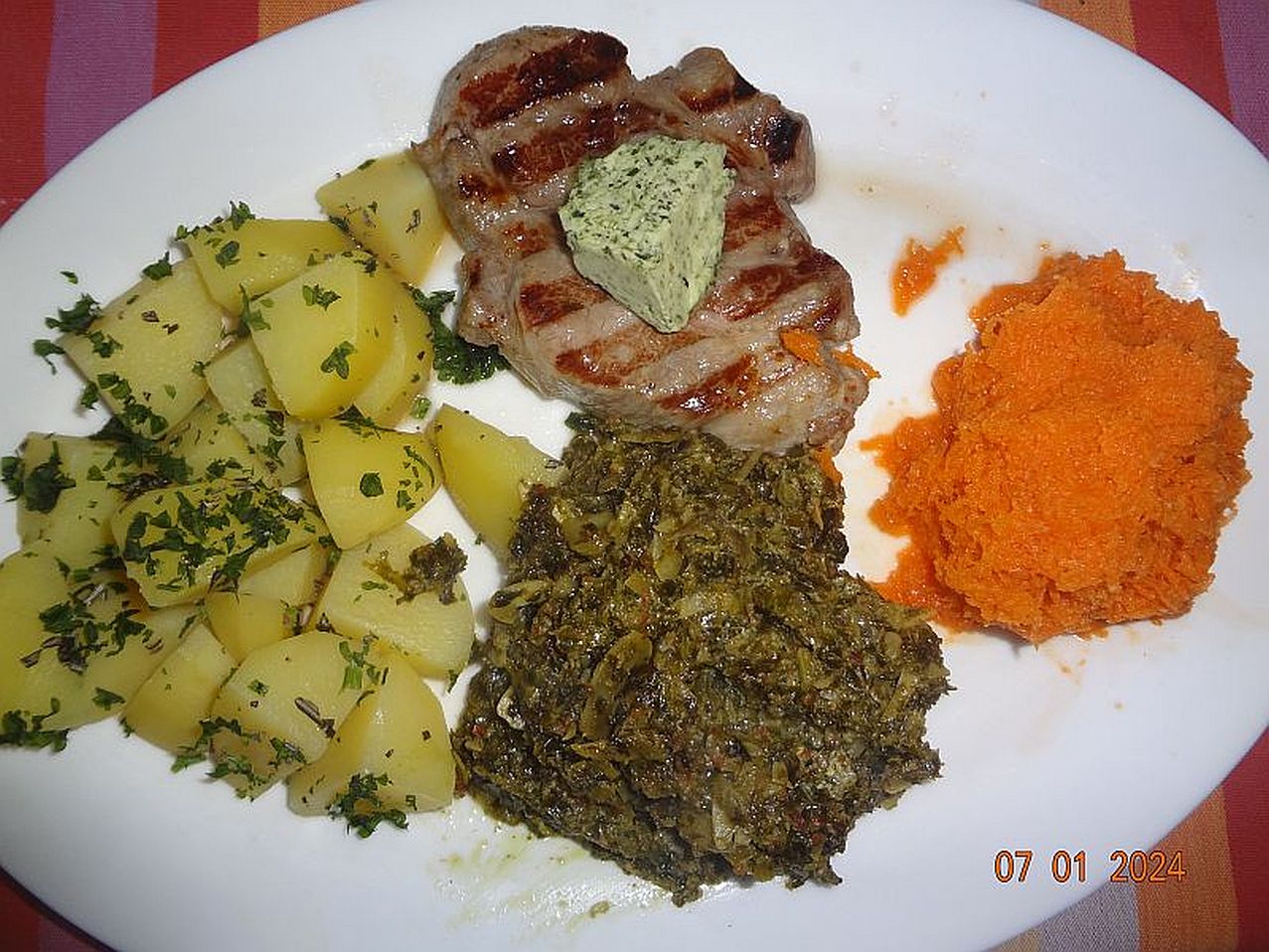 Gegrilltes Nackensteak mit Kräuterbutter, Grünkohl(mit 8 Zutaten), Pet.-Kart., Möhrensalat |