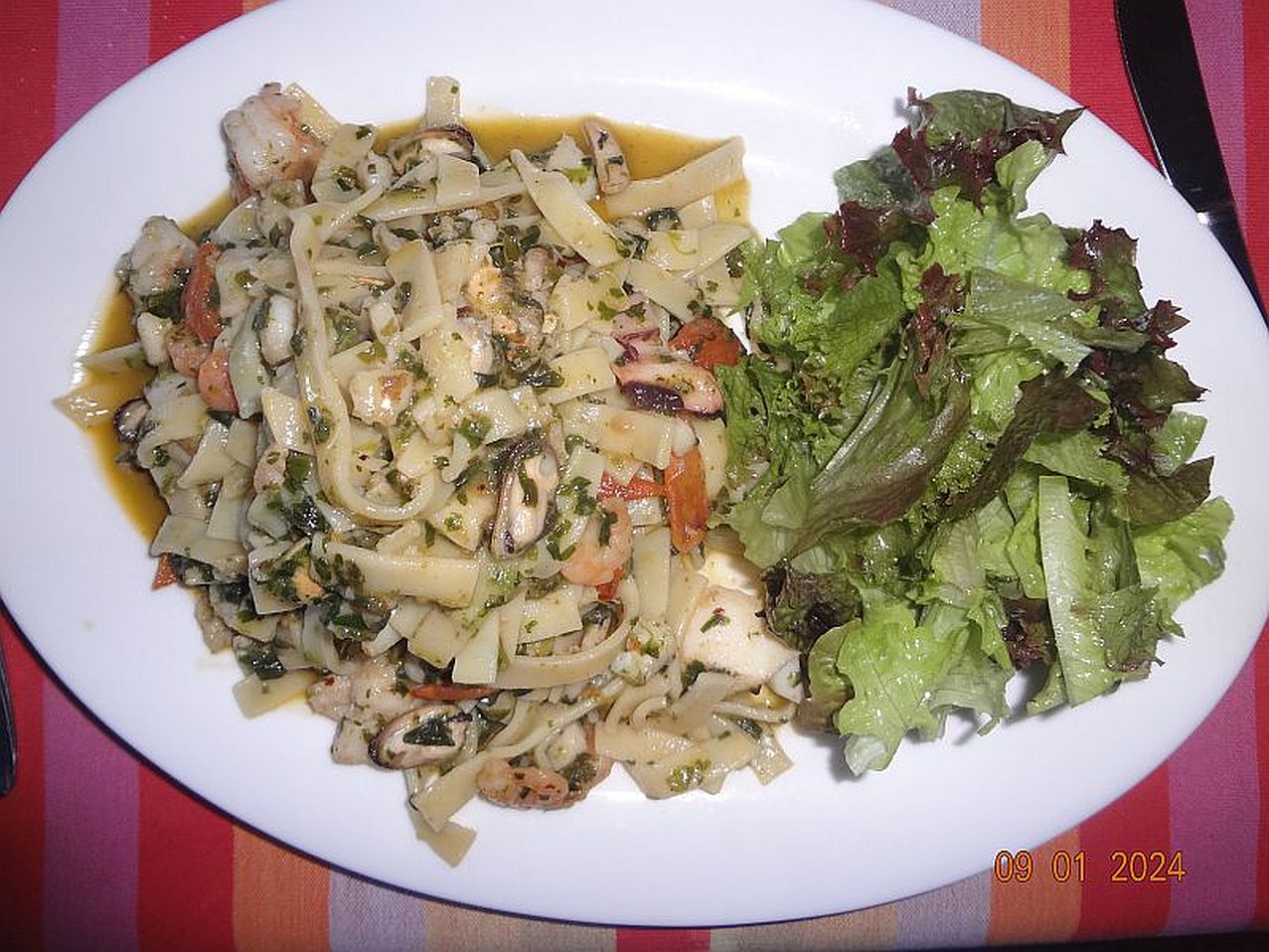 Tagliatelle mit frutti de mare, Frisée-Salat |