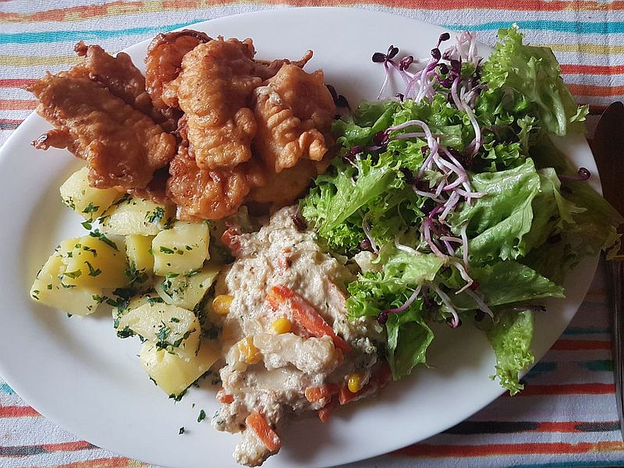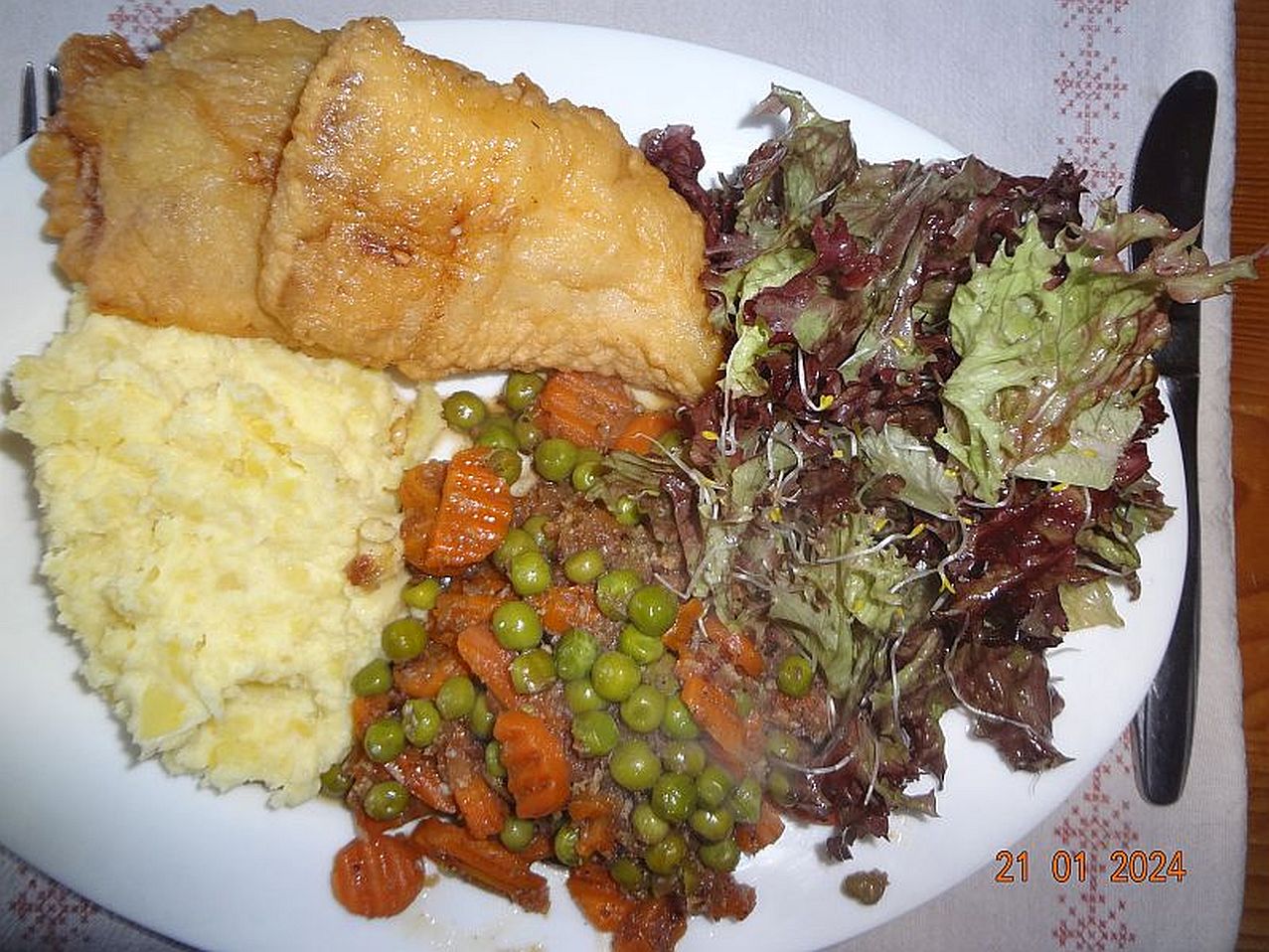 Rotbarsch-Filet im Schlafrock, Leipziger Allerlei, Kartoffelstampf, Lollo-Rosso-Salat mit Ahornsirup, Zitronensaft, Leinöl |