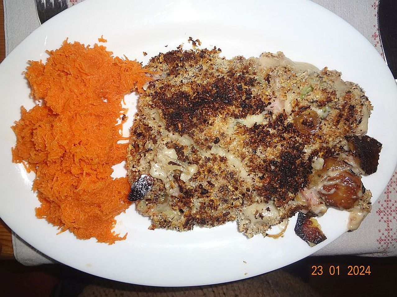 Kartoffel-Kasseler-Brokkoli-Auflauf mit Käse-Schmand-Soße, mit Käse und Haselnüssen überbacken, Möhrensalat |