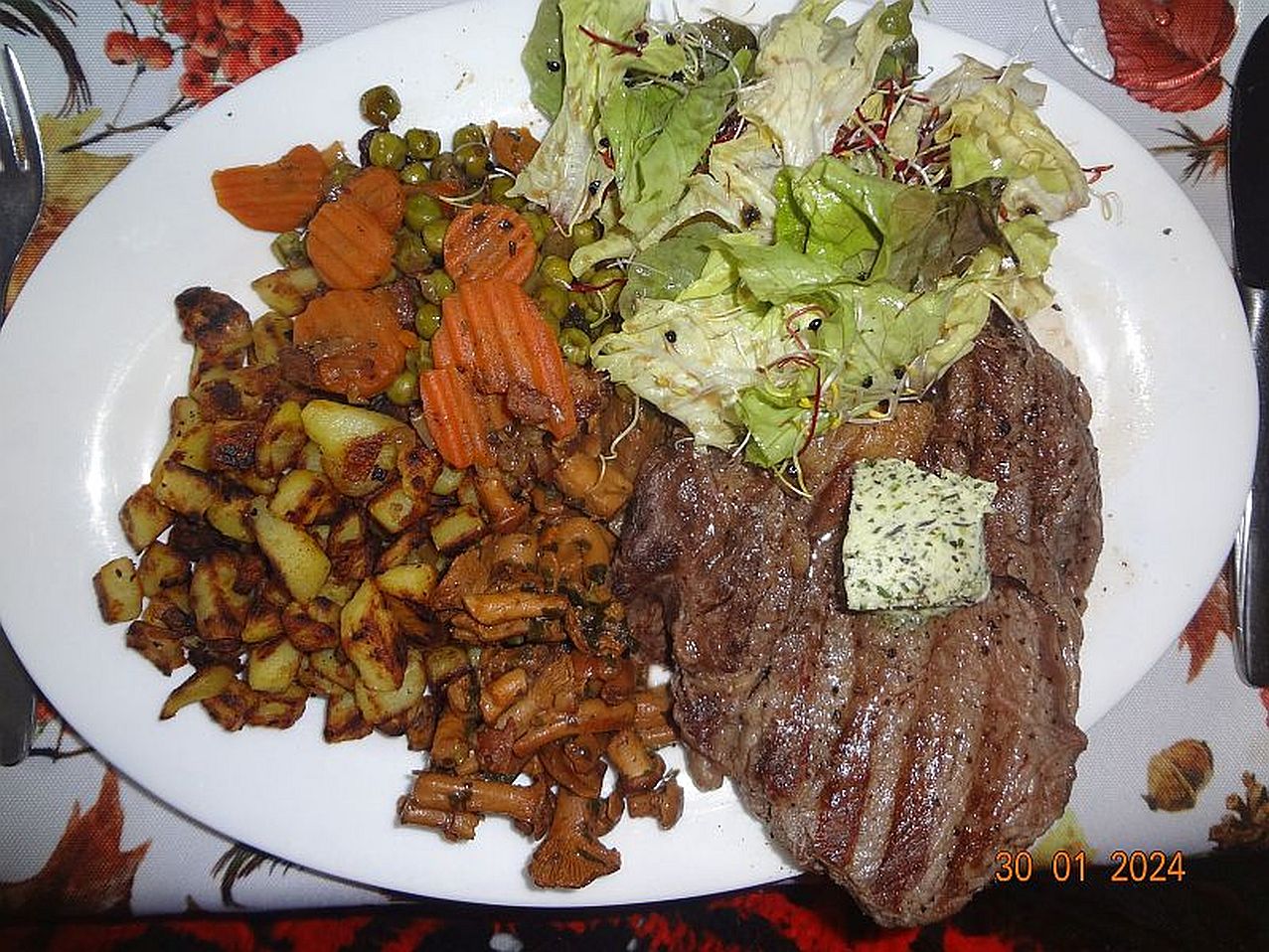 Entrecôte, Pfifferlinge, Mischgemüse, geröstete Kartoffel-Würfel, Eichblatt-Salat mit diversen Sprossen |
