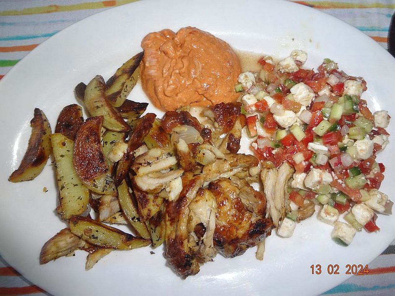 Hähnchen-Döner-Spieß, gebratene Rosmarin-Kartoffel-Spalten, Schmand-Ajvar-Tomaten-Dip |