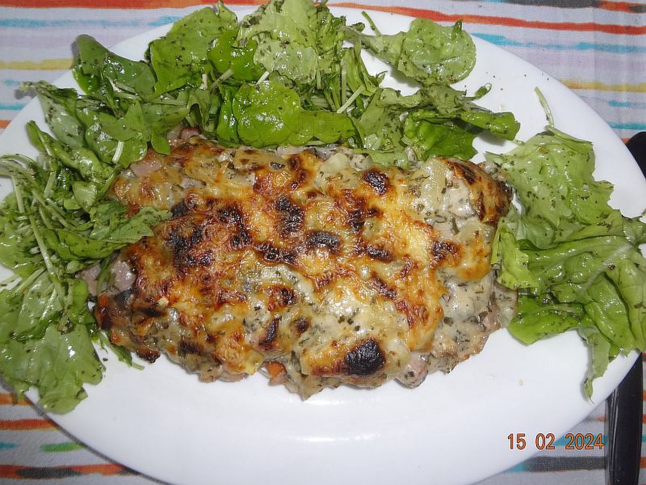Kasseler-Ananas-Gemüse-Auflauf, Eichblatt-Salat mit Kräutern, Ahornsirup, Zitronensaft, Leinöl |
