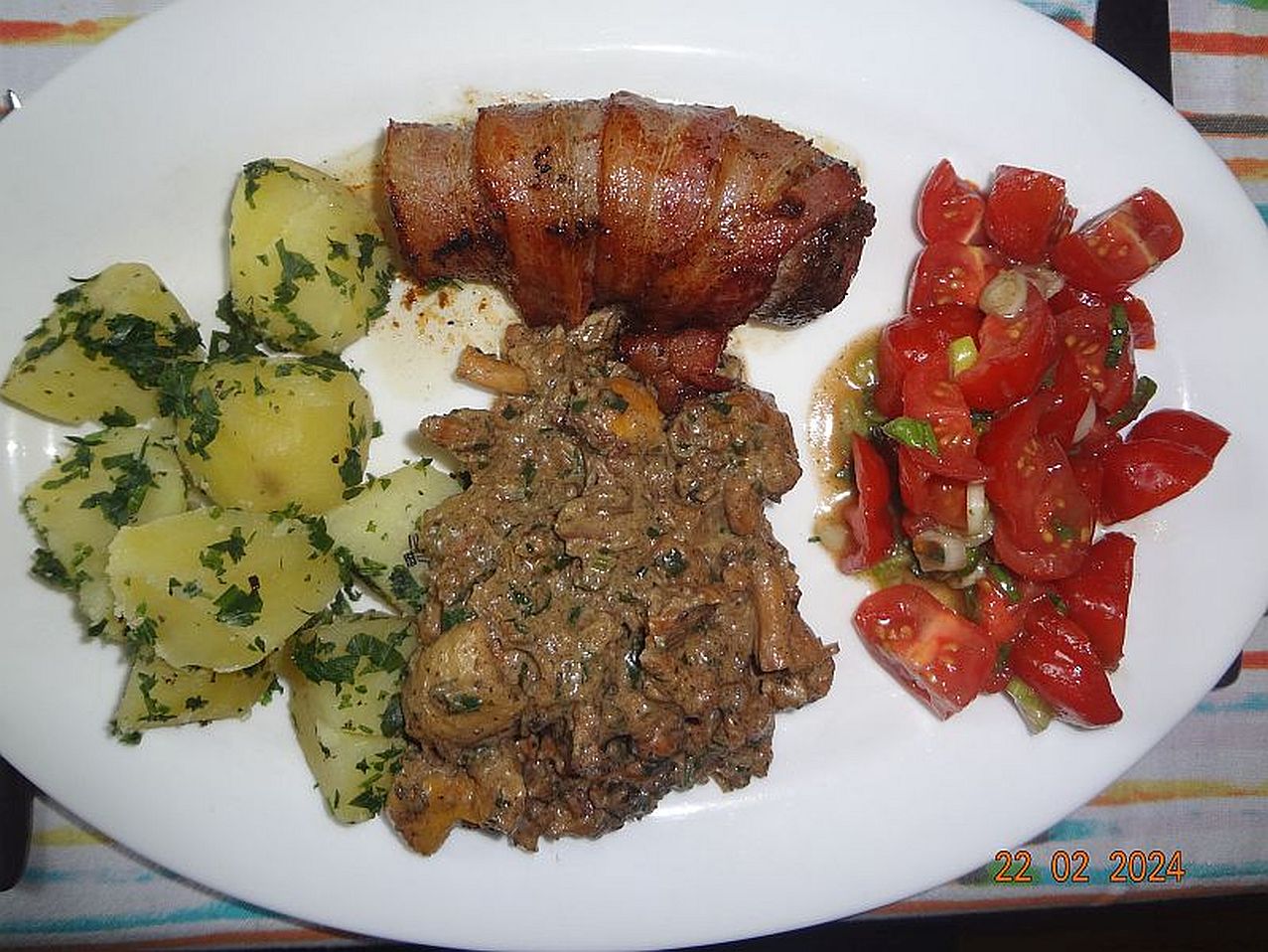 Rinder-Hackfleisch-Rolle mit Steinpilzen, Pfifferlingen, Pet.-Kart., Tomaten-Salat |