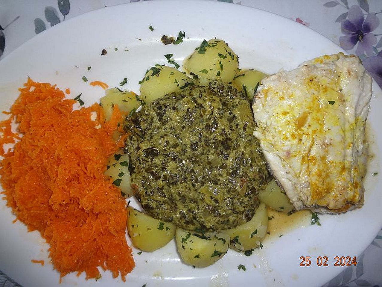 Gebratener Schellfisch, Spinat in Sekt-Schmand-Soße, Pet.-Kart., Möhrensalat |
