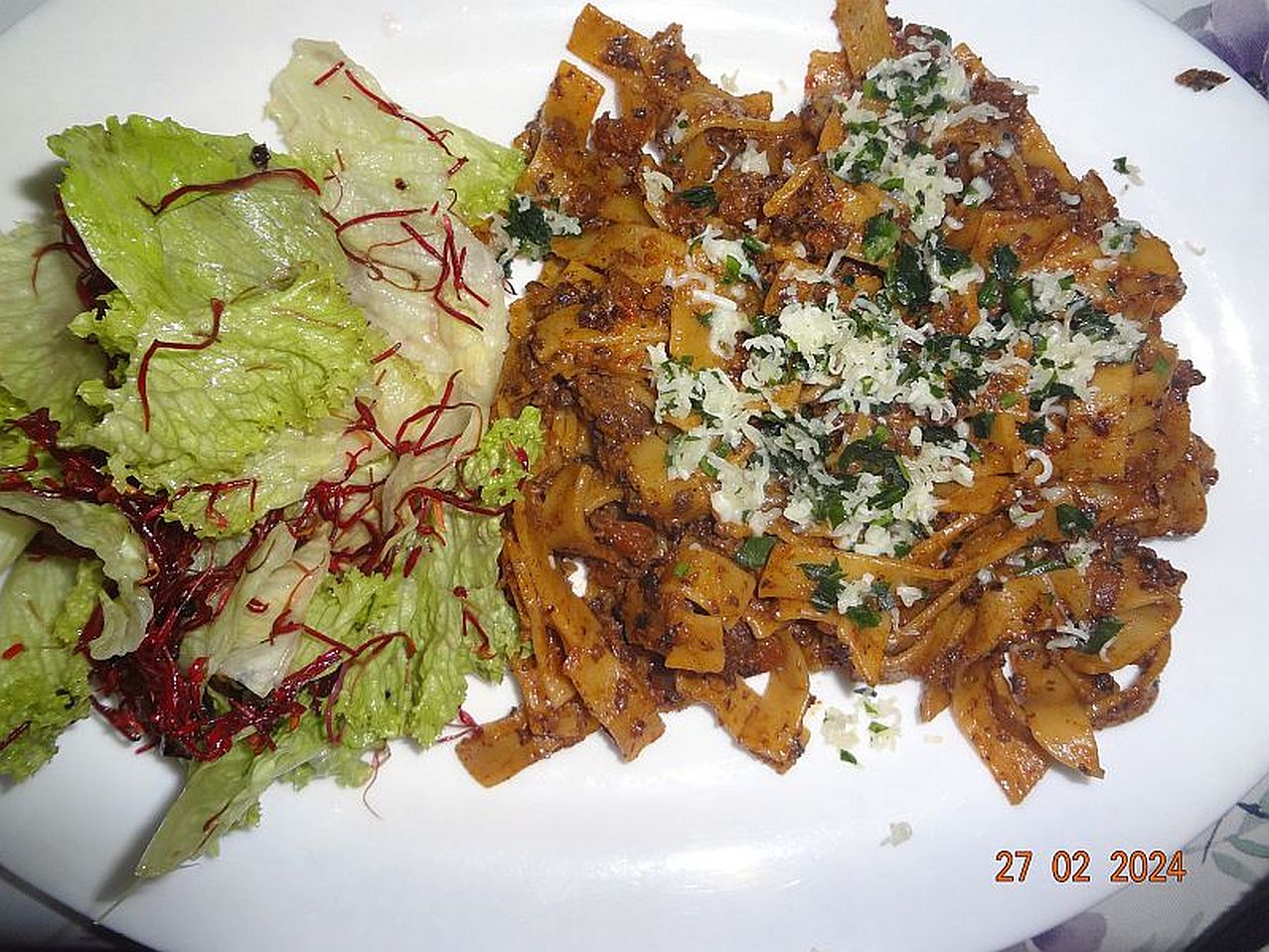 Ragu alla bolognese, in Gemüsebrühe gebratene Tagliatelle, Frisée-Salat mit Rote-Bete-Sprossen |