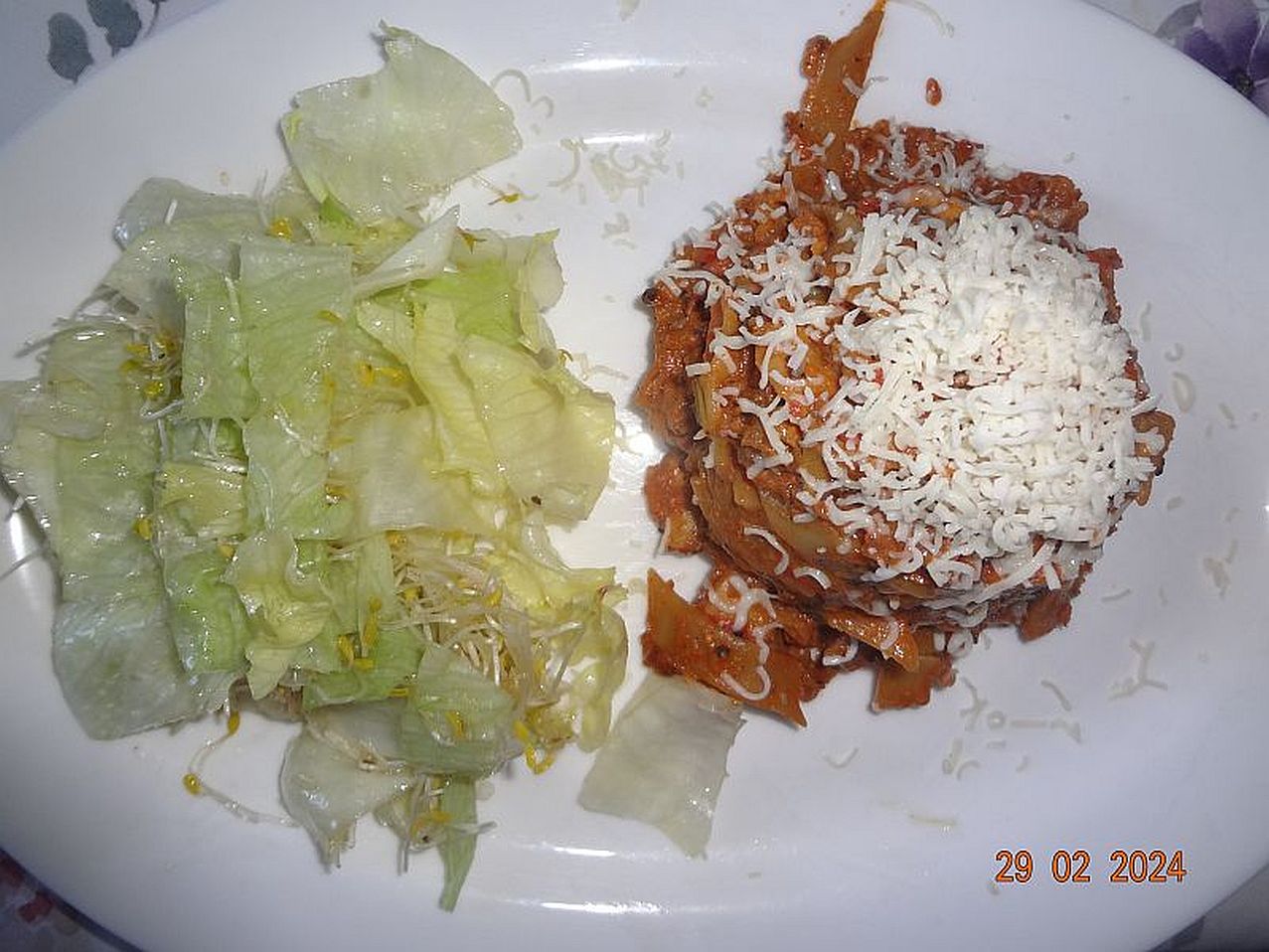 Paella gemischt mit Ragu alla bolognese, Eisberg-Salat mit Sprossen |