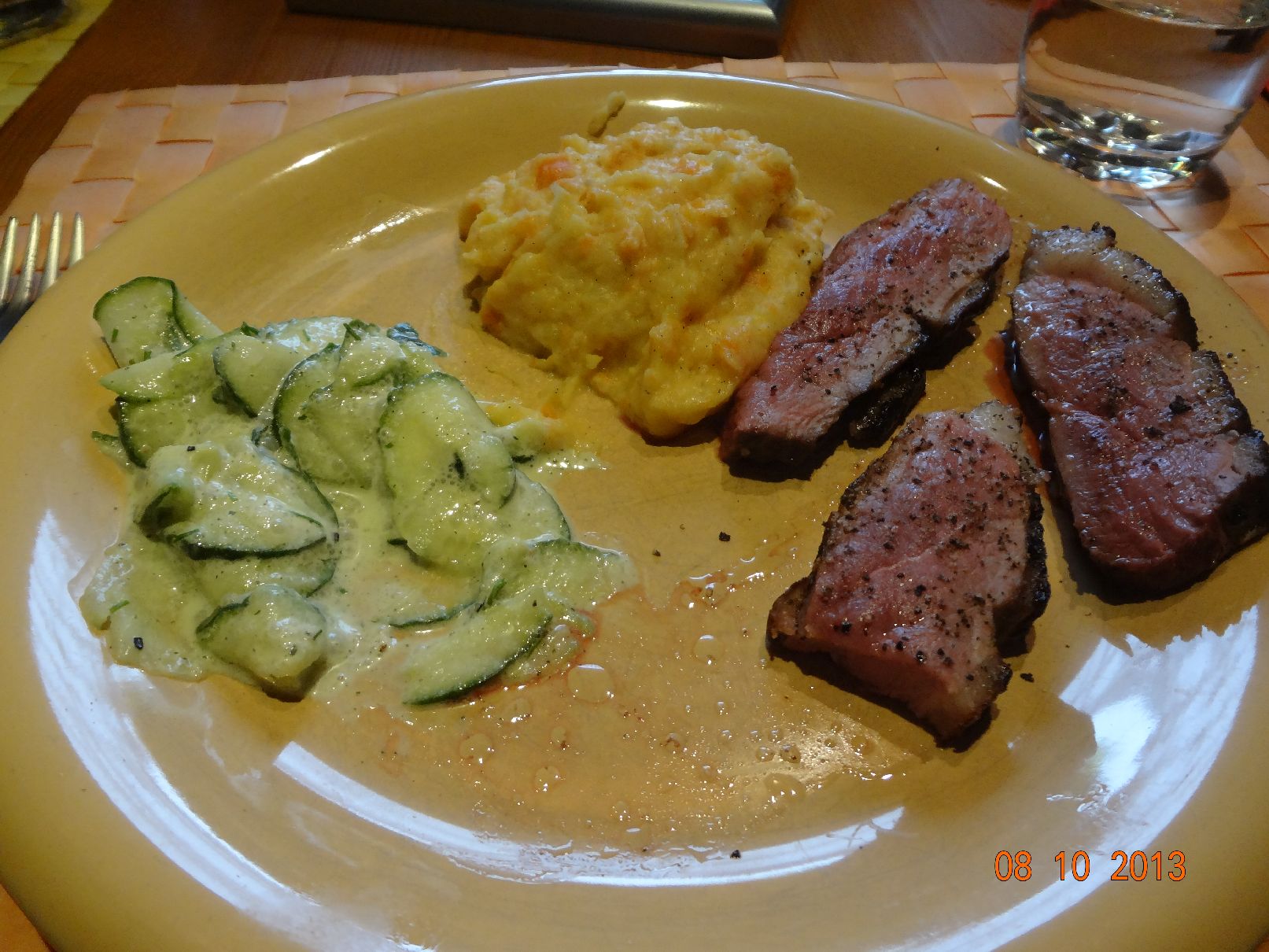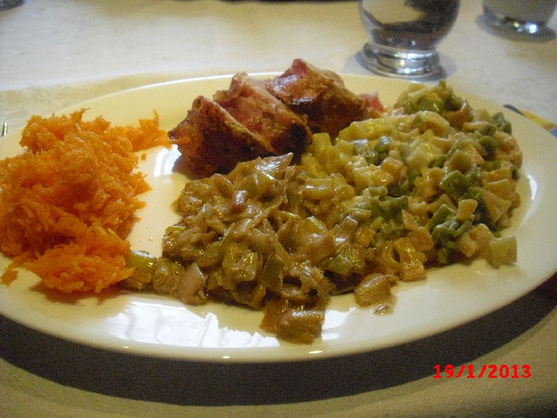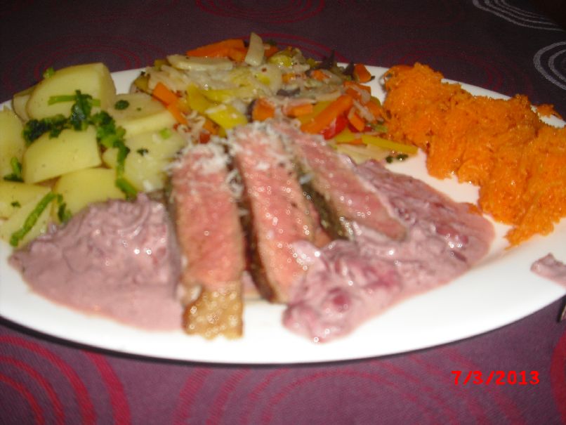 | Enten-Brust, Kartoffel-Püree mit Möhren, Gurken-Salat |