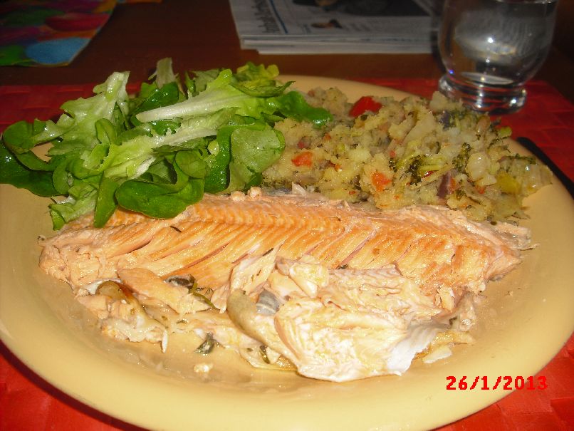 | Geräuchertes Lachs-Filet, Kartoffel-Käse-Püree und Suppen-Gemüse |