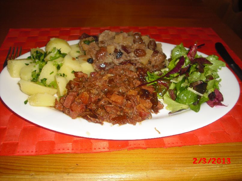 | Rinder-Gulasch mit Rum-Rosinen-Sauerkraut und Feld-Salat |