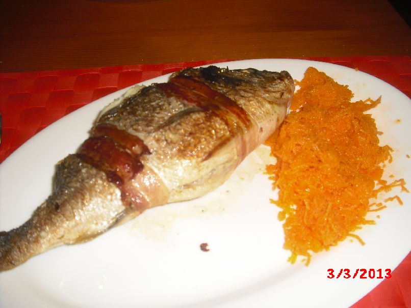 | Mit Gemüse gefüllte Dorade in Schinken-Streifen |