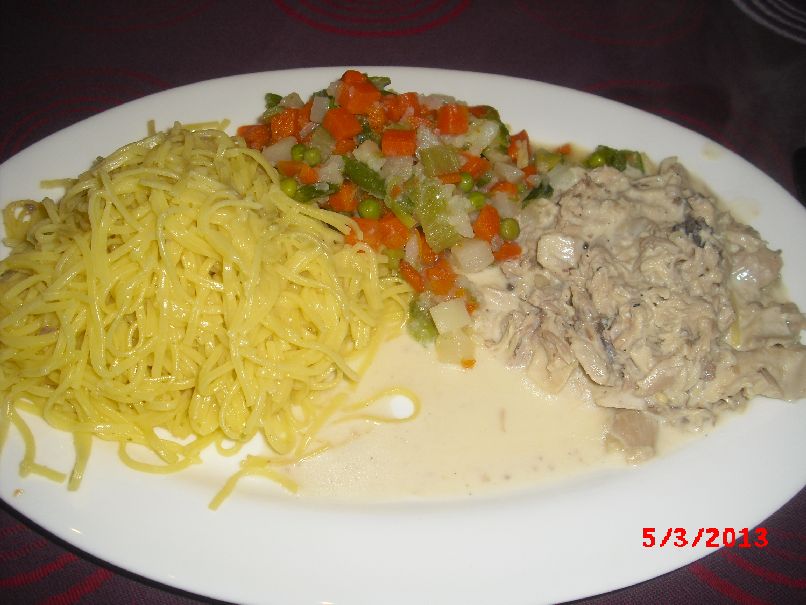 | Hühner-Frikassee, Käse-Spaghetti und Misch-Gemüse |