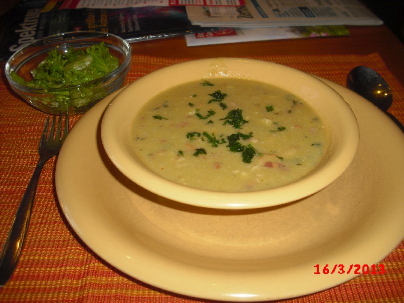 | Erbsen-Suppe mit Räuchersaibling und Lollo-Biondo-Salat |