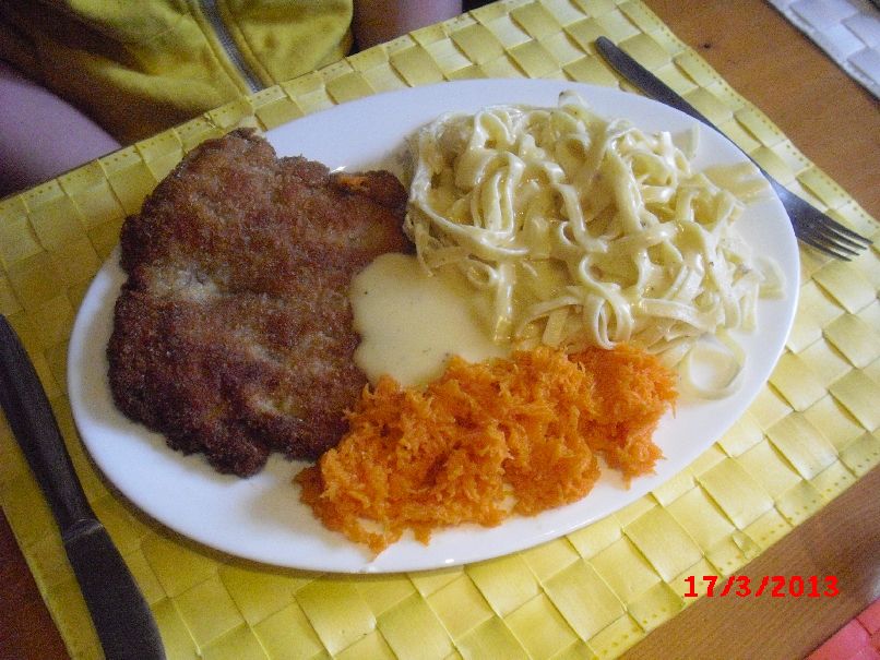 | Hähnchen-Schnitzel, Nudeln mit Spargel-Soße und Möhren-Salat |