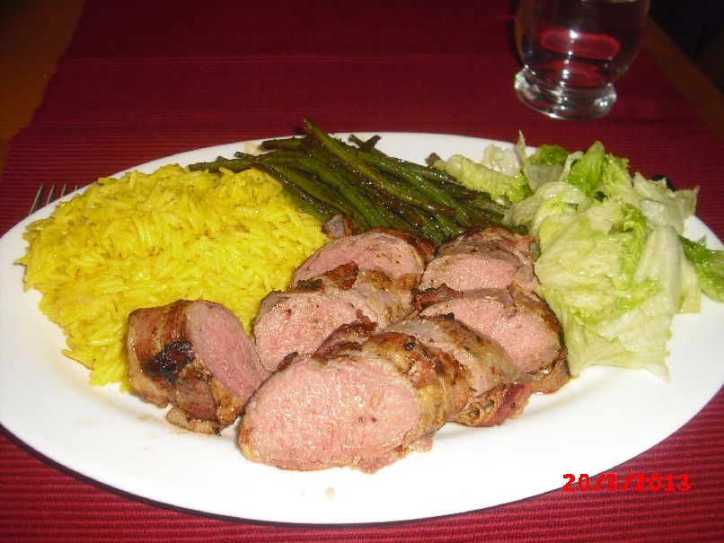 | Lamm-Rücken im Speck-Mantel mit Bohnen und Käse-Safran-Basmati-Reis |