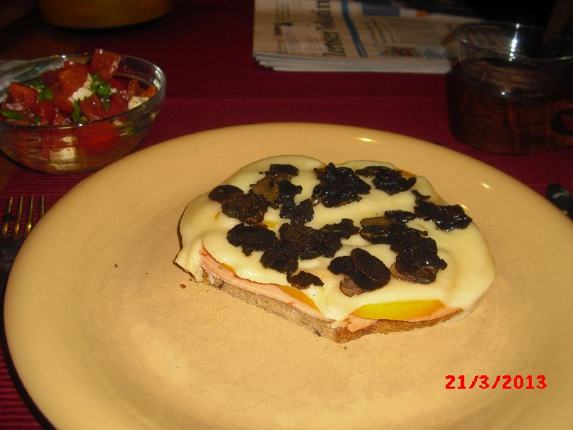 | Getrüffelter Toast Hawai, dazu Tomate-Mozzarella-Salat mit Basilikum |