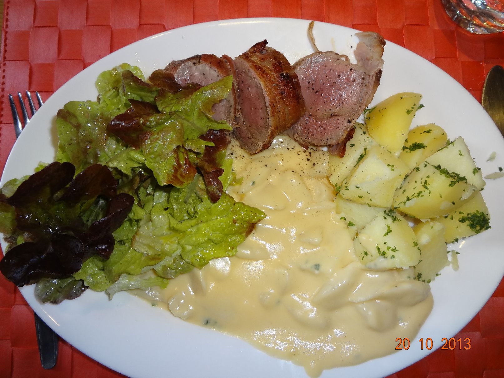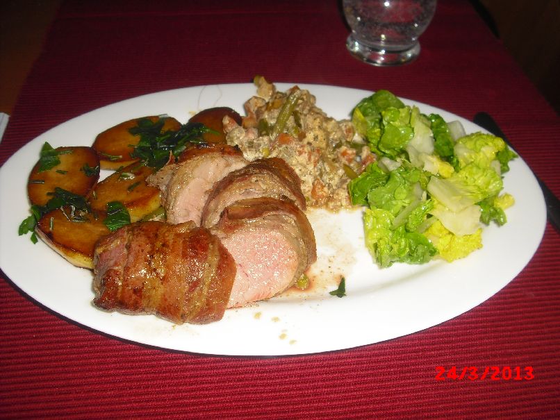 | Marinierte Schwein--Filet-Medaillons im Speck-Mantel mit Gemüsebrat-Kartoffeln und Eisberg-Salat |