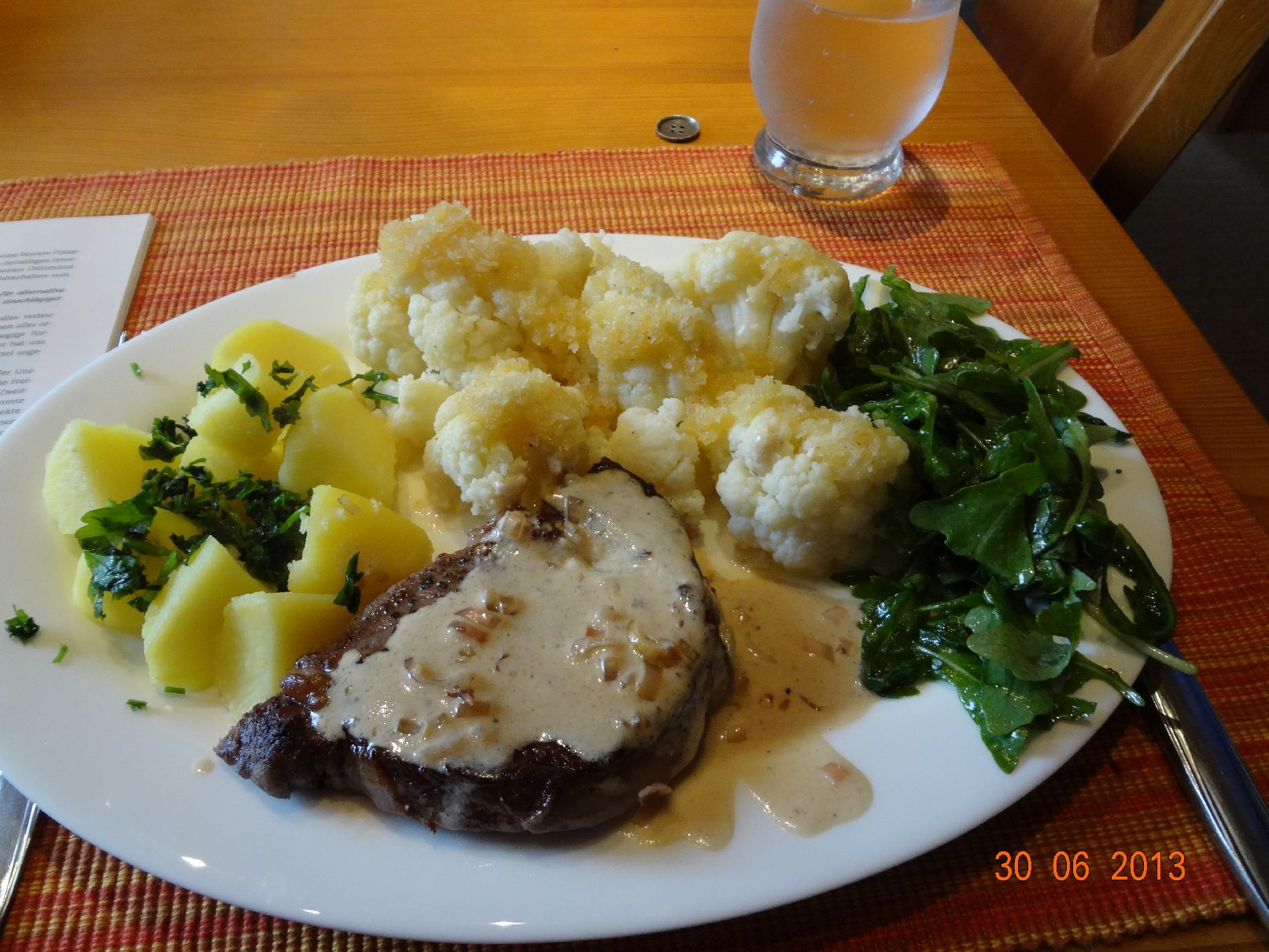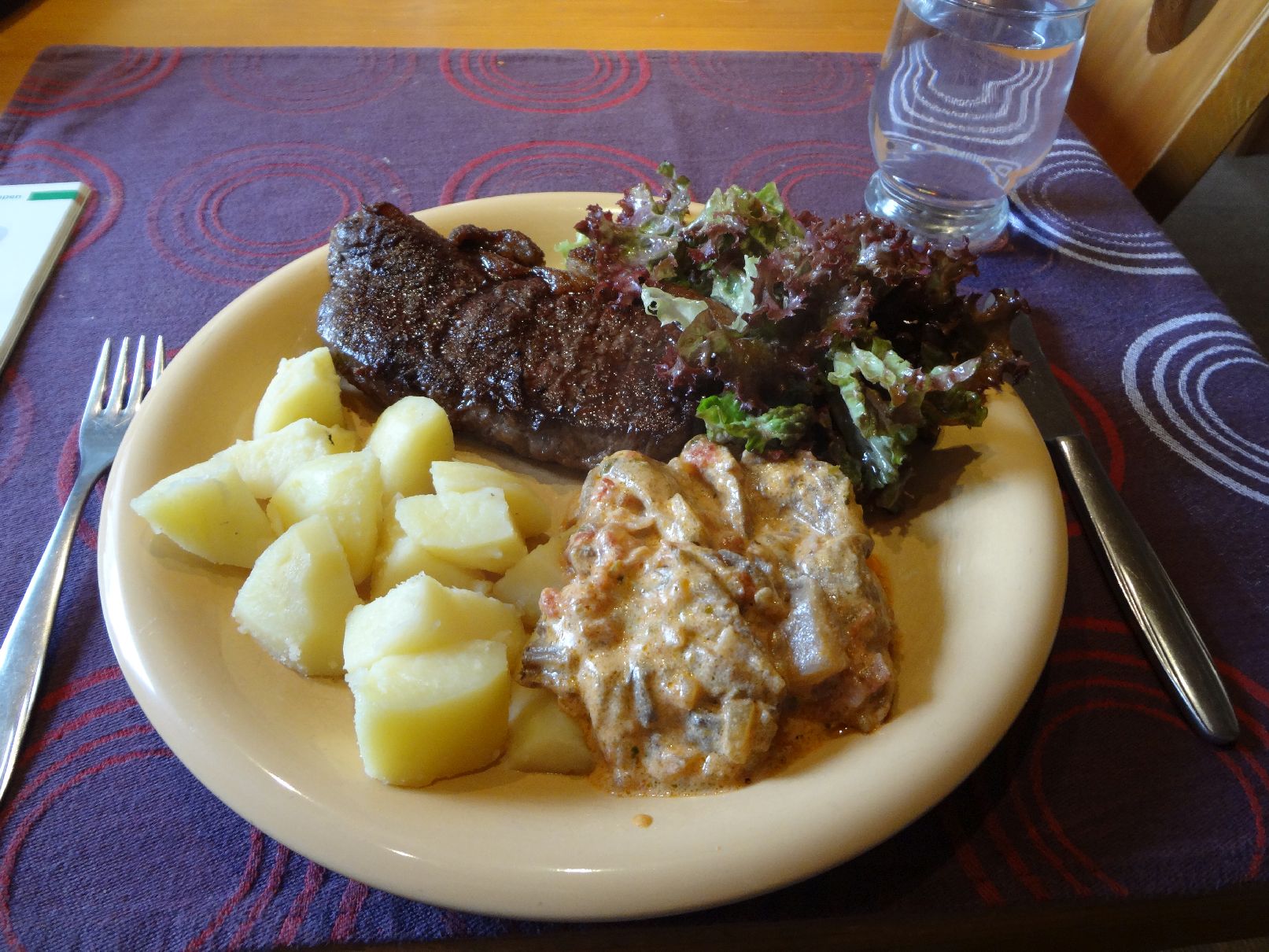 | Steak vom Wagyu-Rind, Misch-Gemüse, Rauch-Kartoffeln und Lollo-Rosso-Salat |
