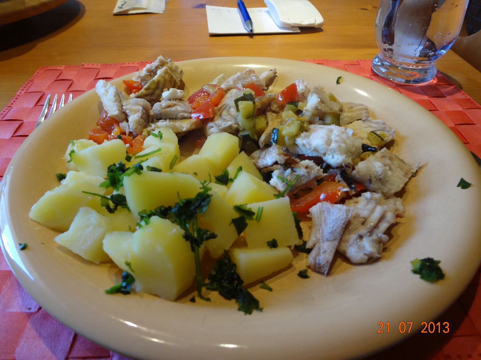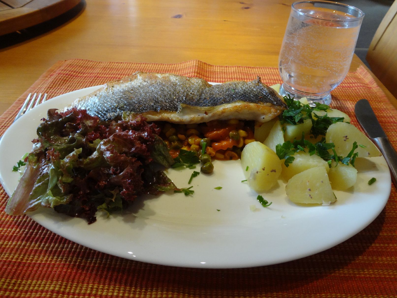 Red Snapper, selbstgemachte Nudeln, Mischgemüse und Feld-Salat |
