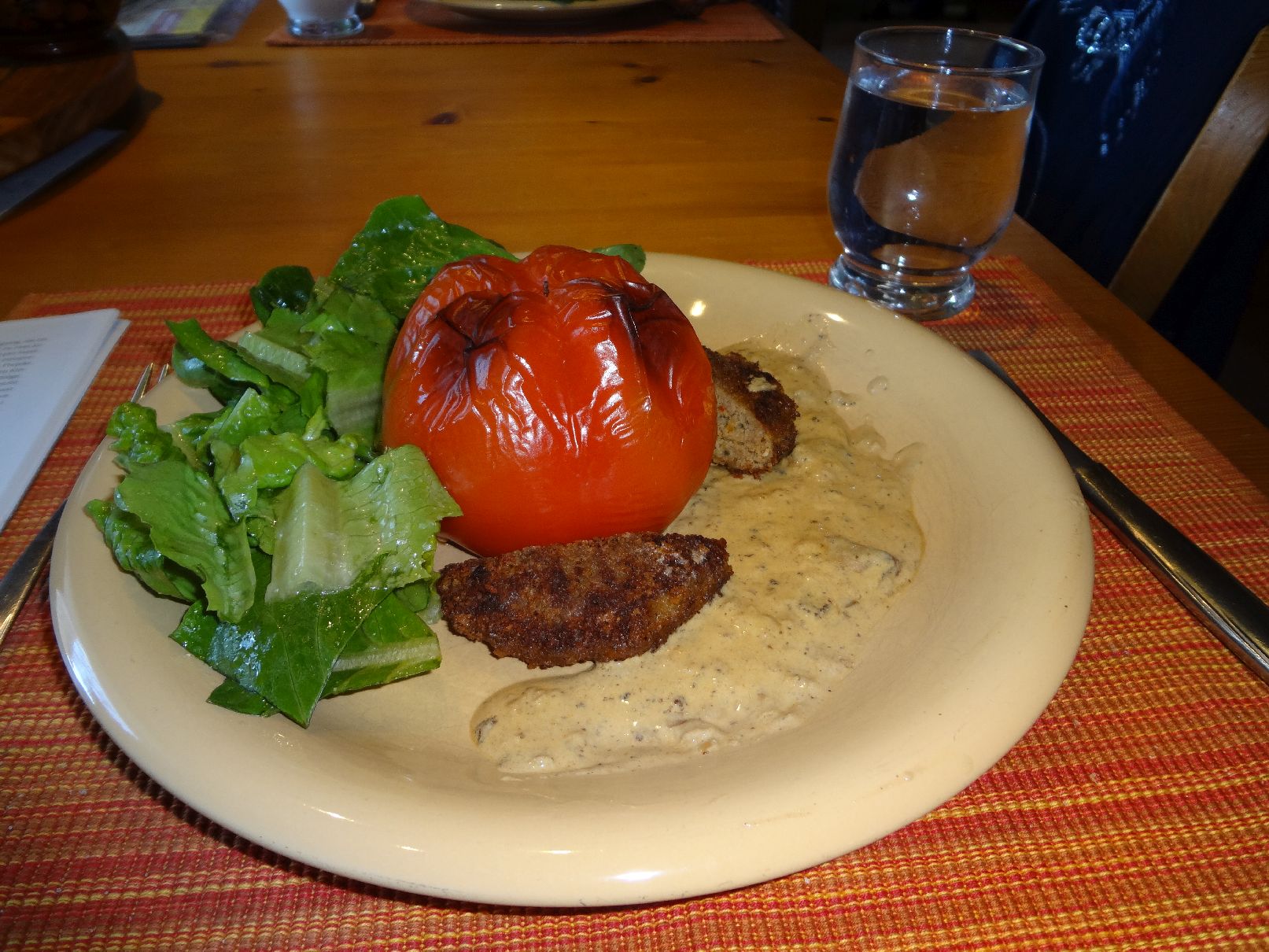 | Gefüllte Paprika, lecker Soße und Salat |