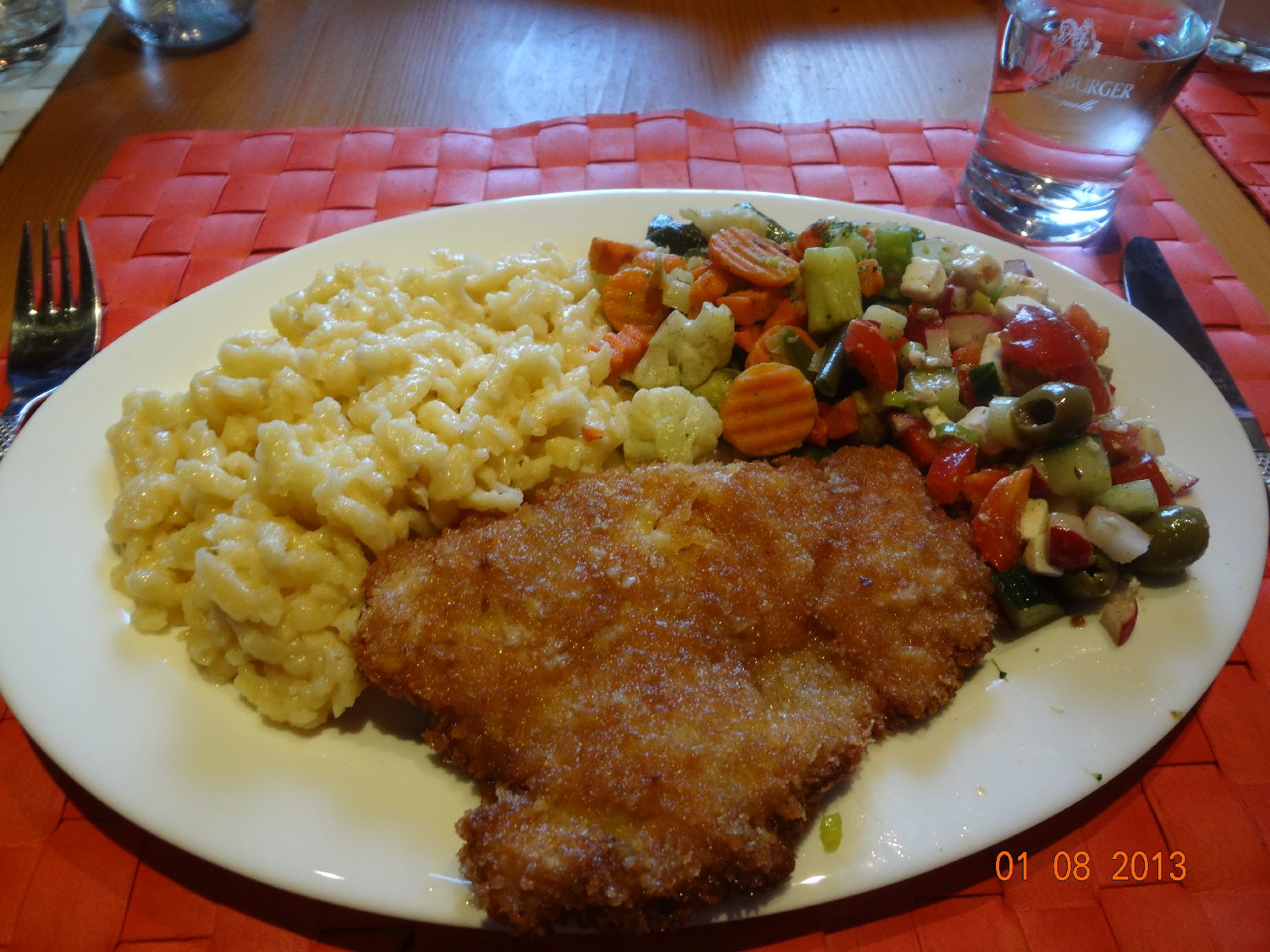 Hähnchen-Schnitzel, Käse-Spätzle, Misch-Gemüse aus der Pfanne und Oliven-Feta-Salat |