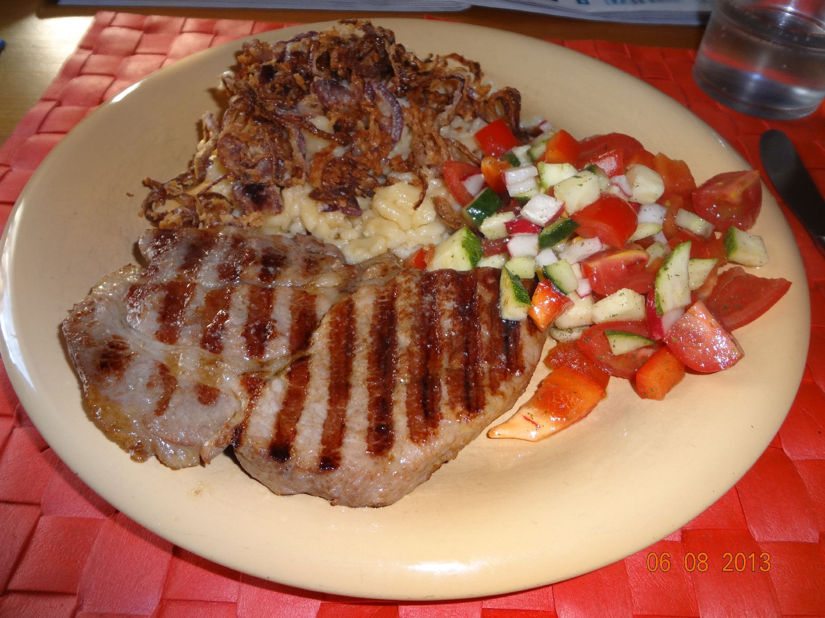 | Steak und Spätzle mit Röstzwiebeln, Tomaten-Gurke-Paprika-Salat |