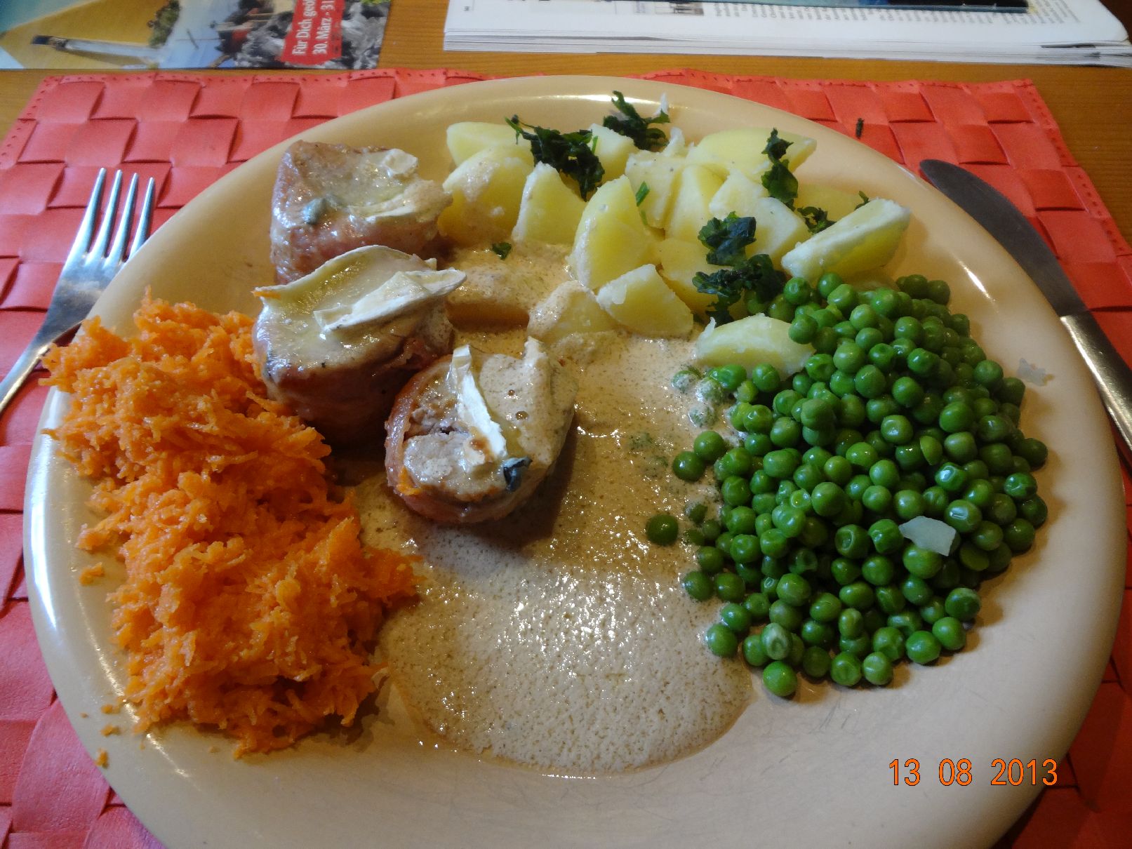 | Schweine-Filet-Medaillons im Speck-Mantel mit Weißwein-Soße, sehr feinen Erbsen und Rosmarin-Kartoffeln |
