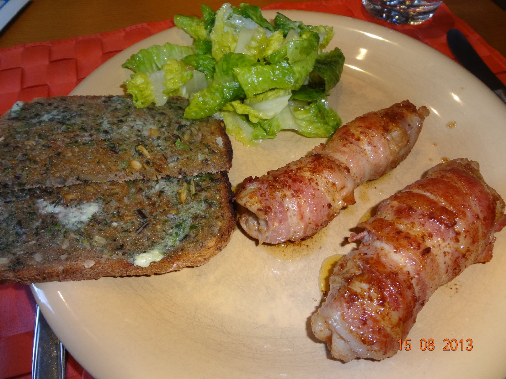 | Filetierte Hähnchen-Schenkel im Speck-Mantel, Röstestulle und Salat |