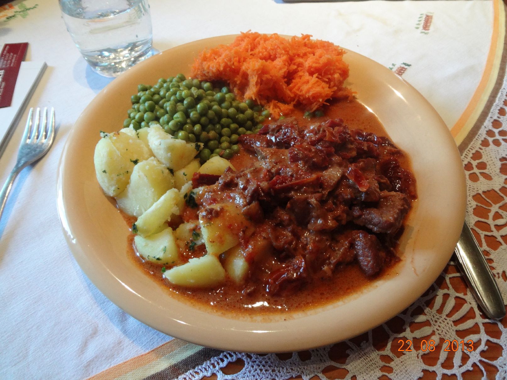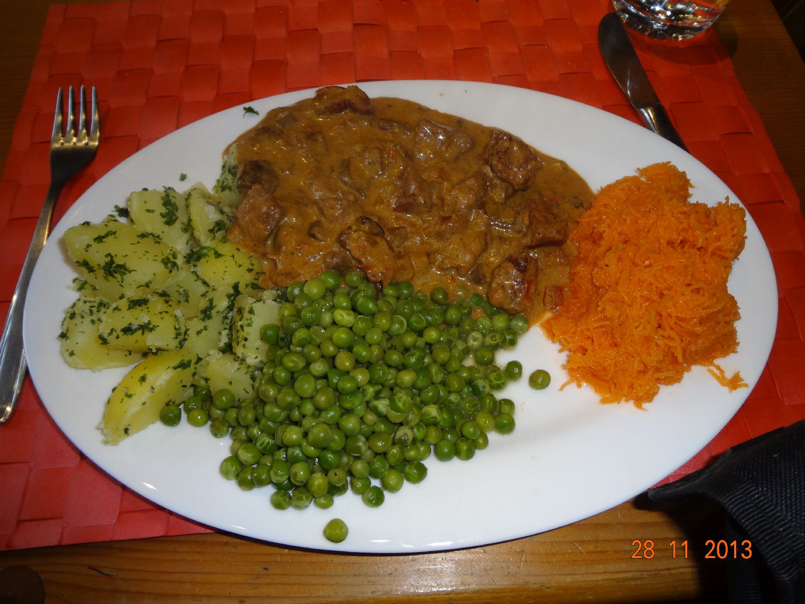 Geschnetzeltes mit feinen Erbsen und Rauchsalz-Kartoffeln mit Möhren-Salat |