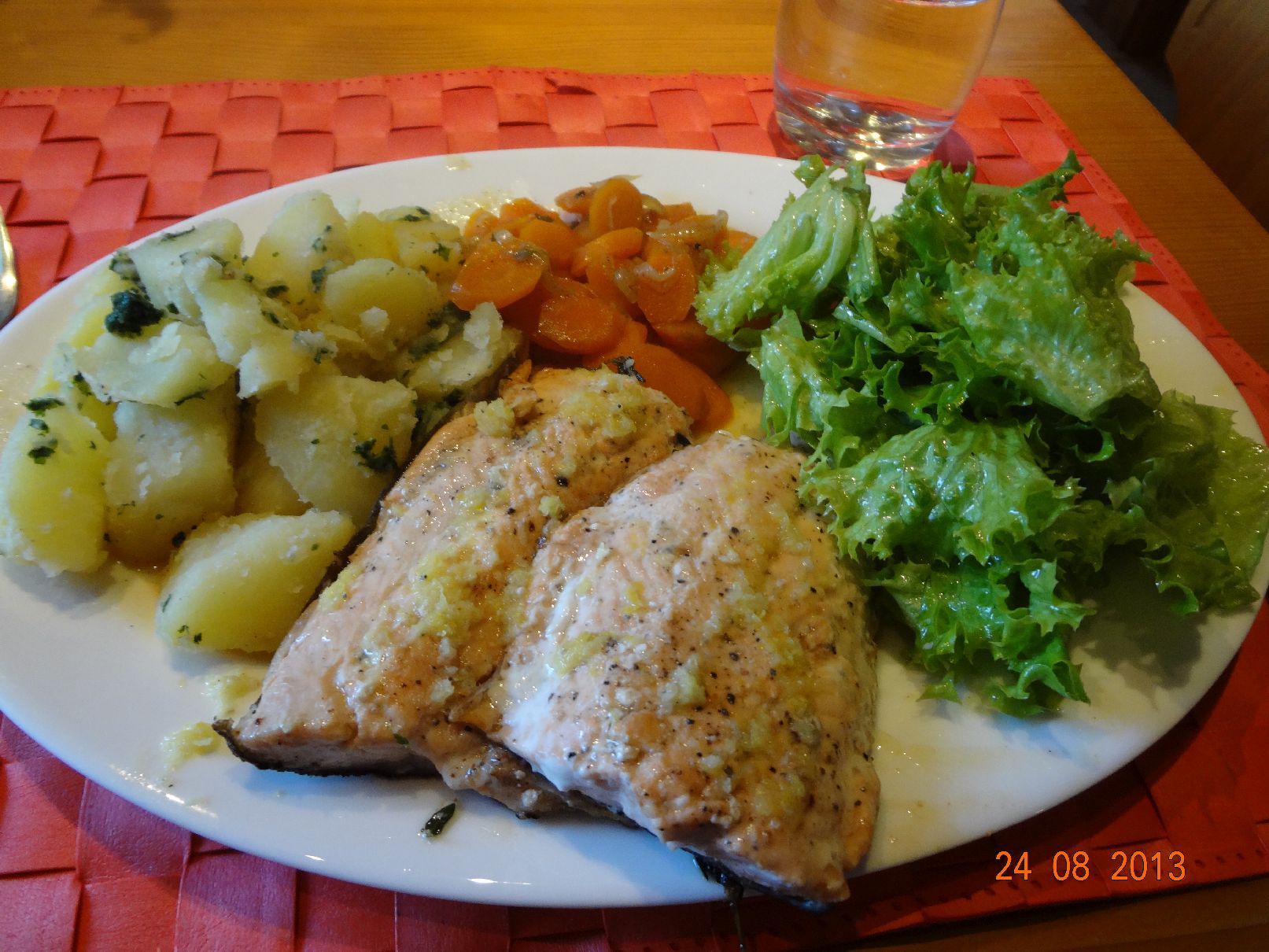 | Lachs mit Misch-Gemüse und Petersilien-Kartoffeln |