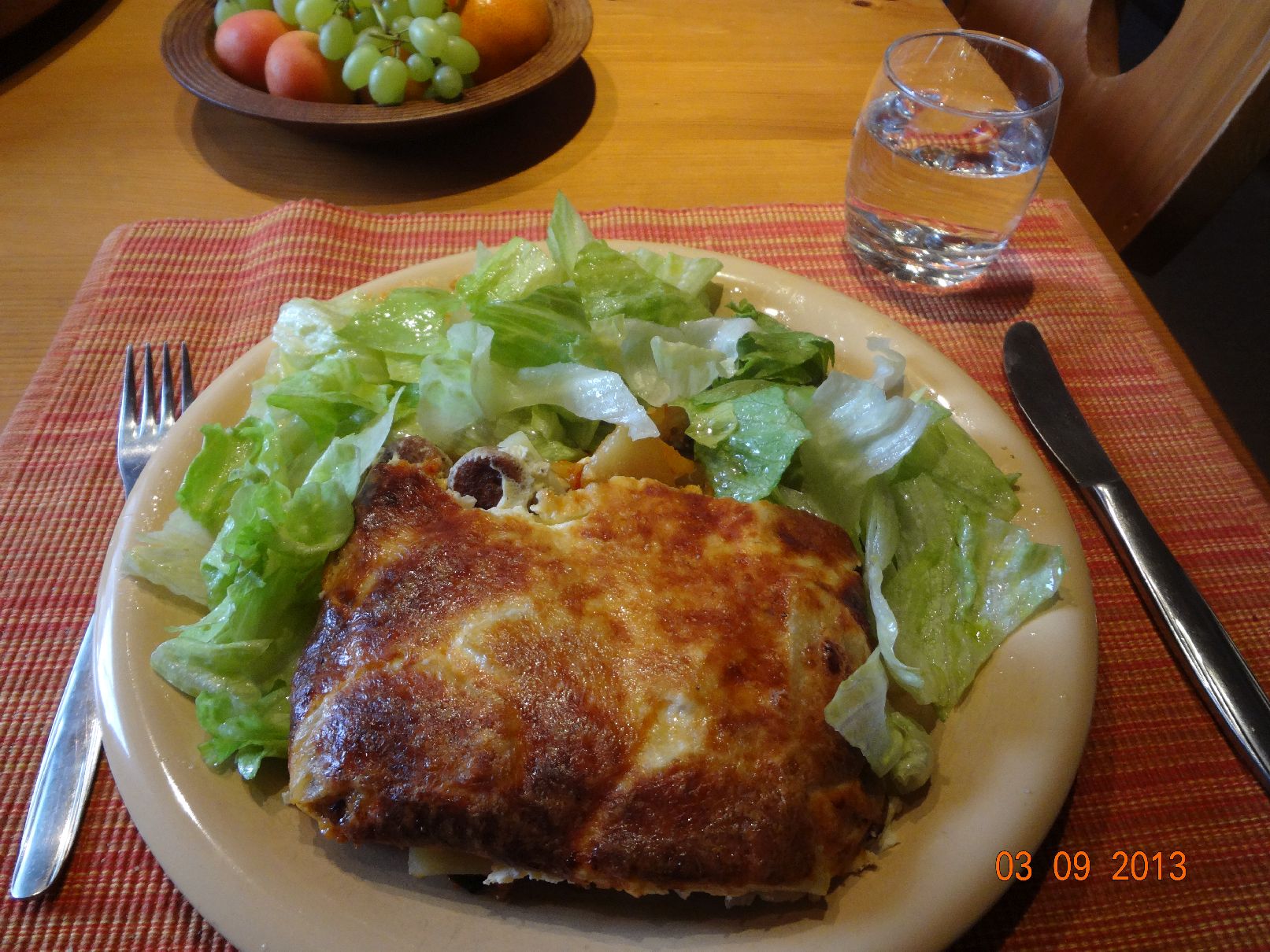 Kartoffel-Bratwurst-Gemüse-Auflauf und Eisberg-Salat |
