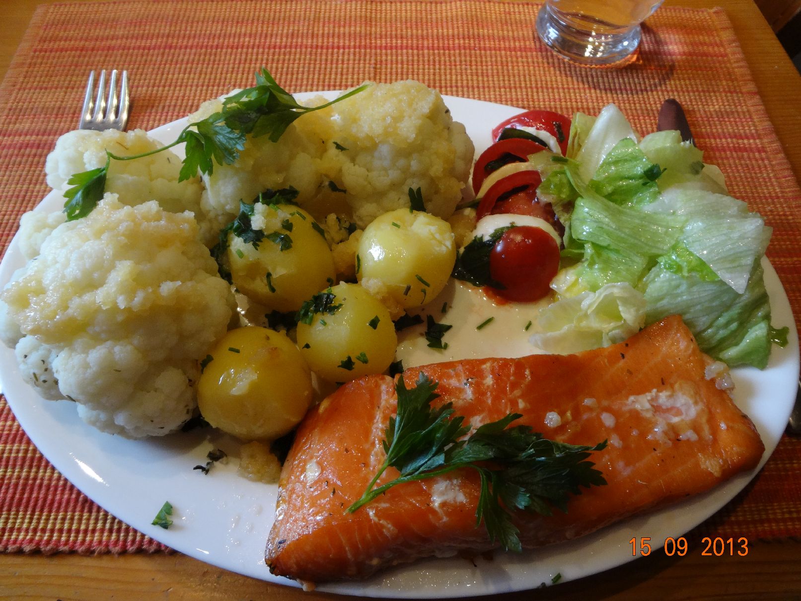 | Selbstgeräuchertes Lachs-Filet mit Blumenkohl, Rosmarin-Petersilien-Kartoffeln und Salat |