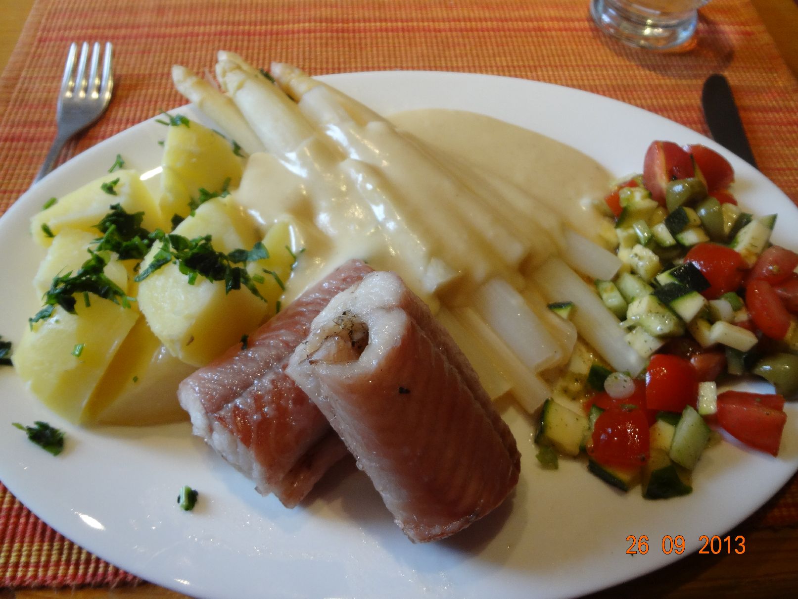 | Selbstgeräucherter Aal mit Spargel, Petersilien-Kartoffeln und Mozzarella-Gemüse-Salat |