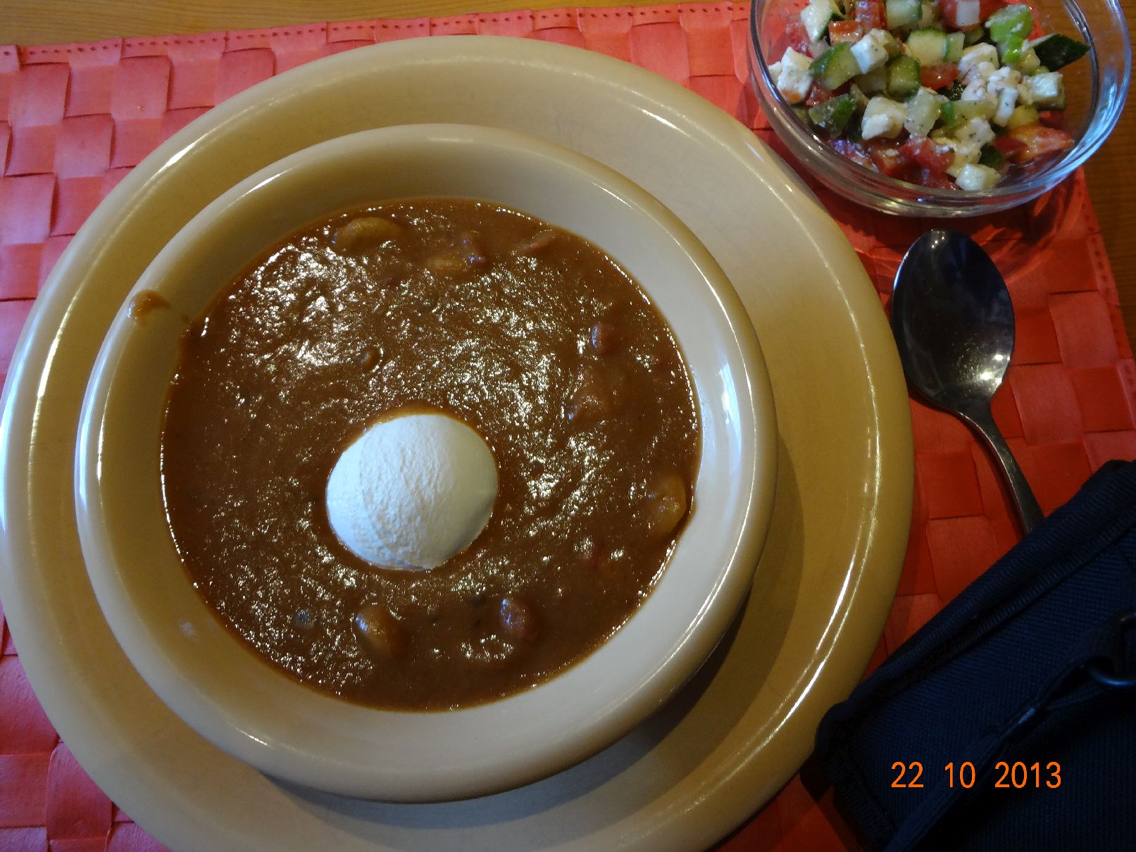 | Reste-Essen (Suppe mit Würstchen + Schmand) mit Paprika-Feta-Salat |