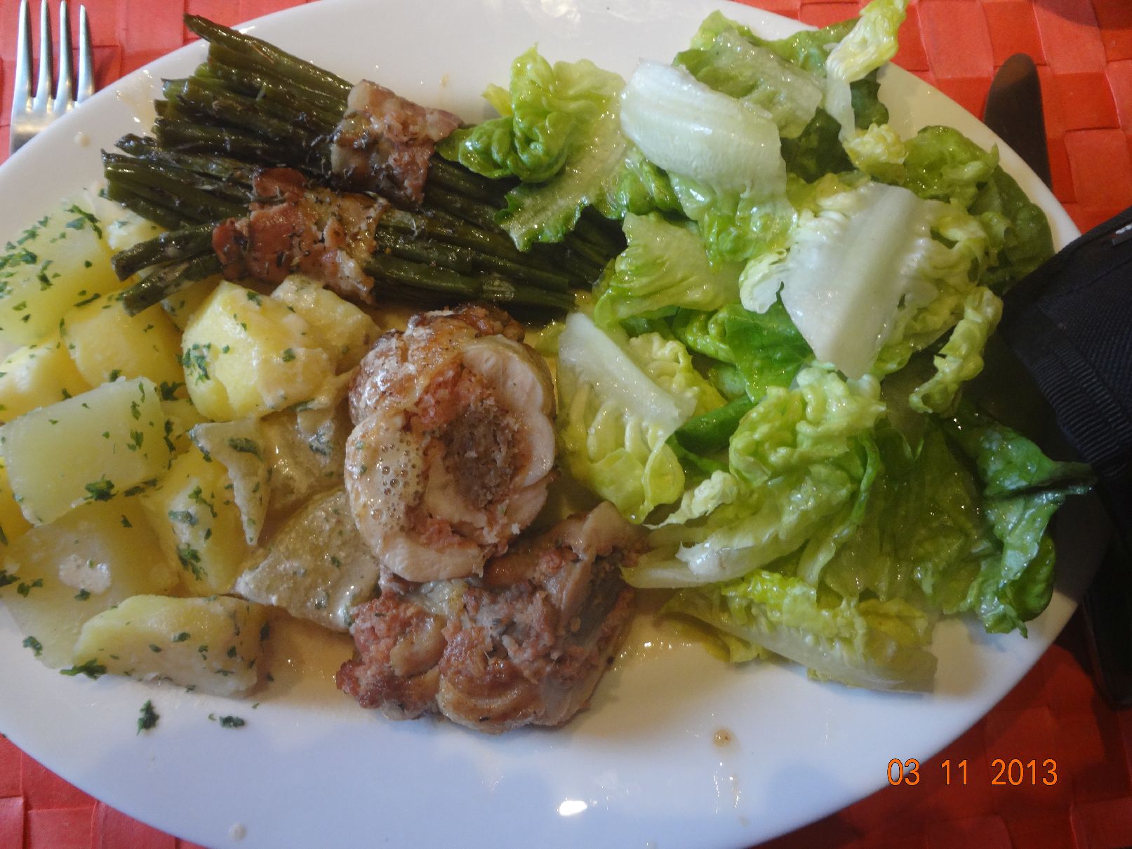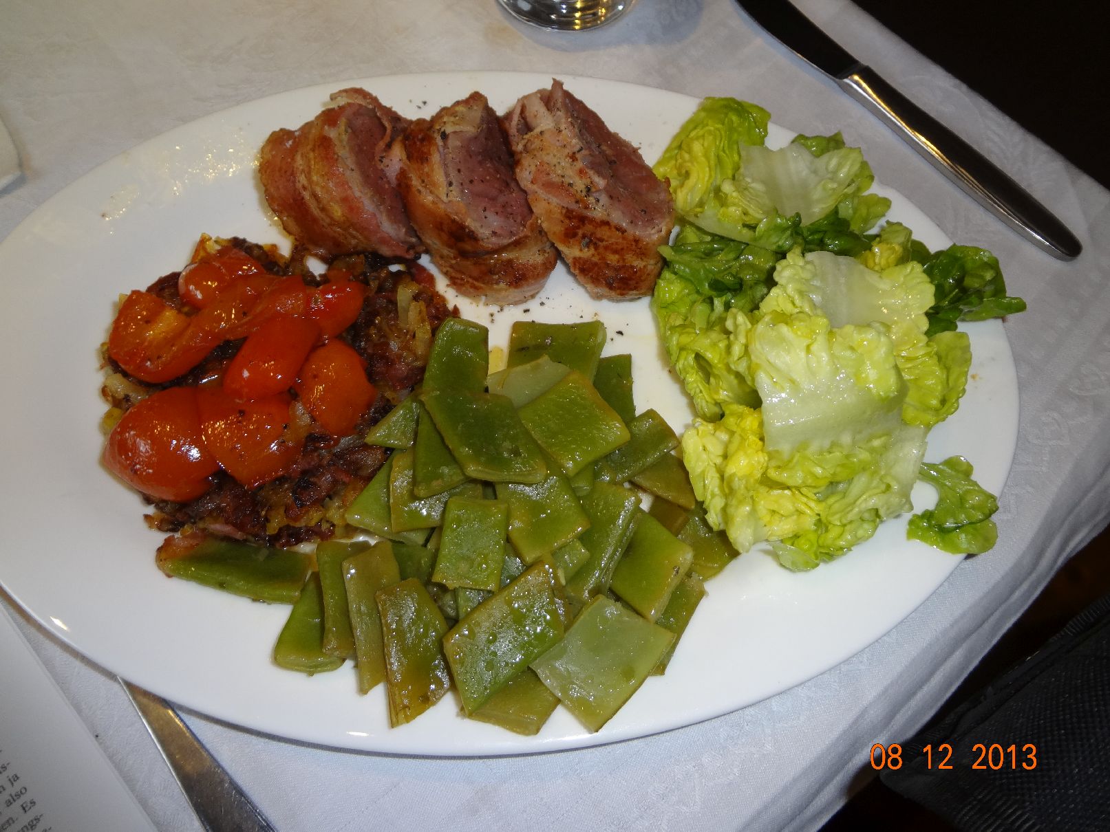 | Lamm-Filet im Speck-Mantel mit Bohnen-Paprika-Tomaten-Gemüse und Rosmarin-Kartoffeln |