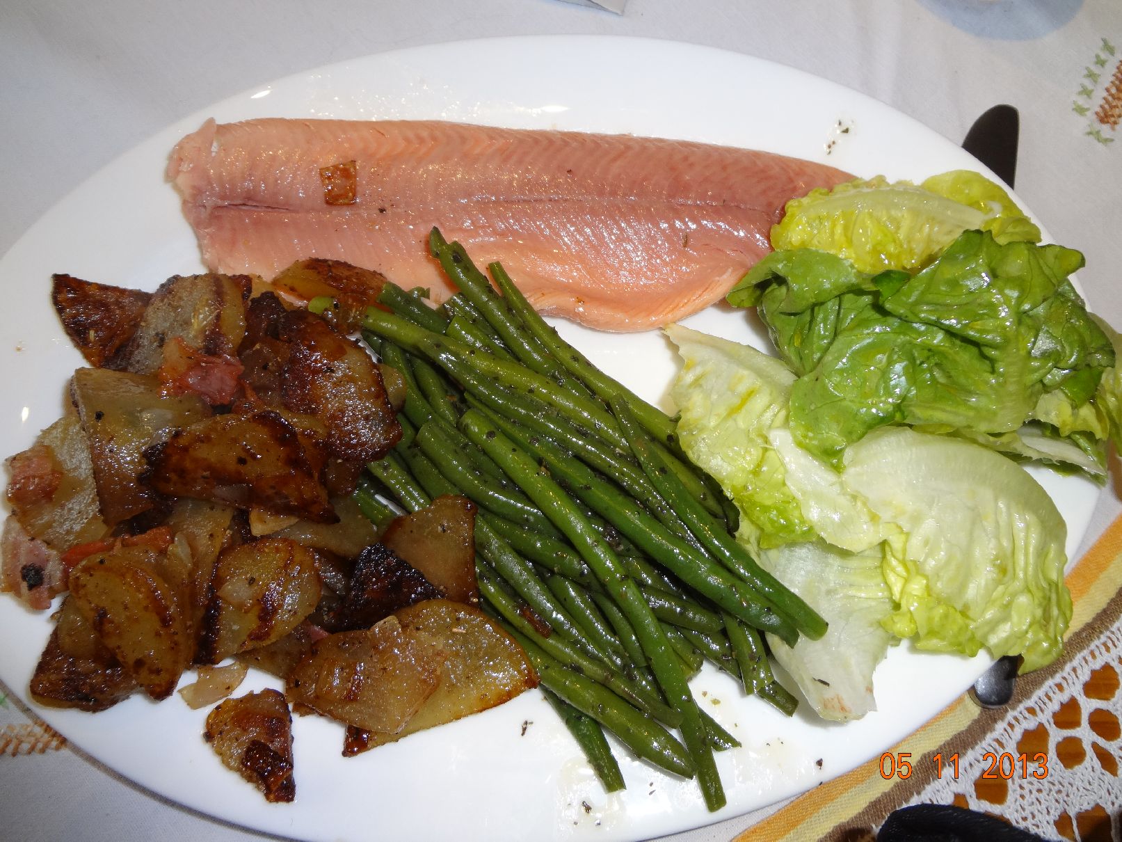 | Bratkartoffeln mit geräucherter Lachsforelle (-Filetiert) und grünen Bohnen |
