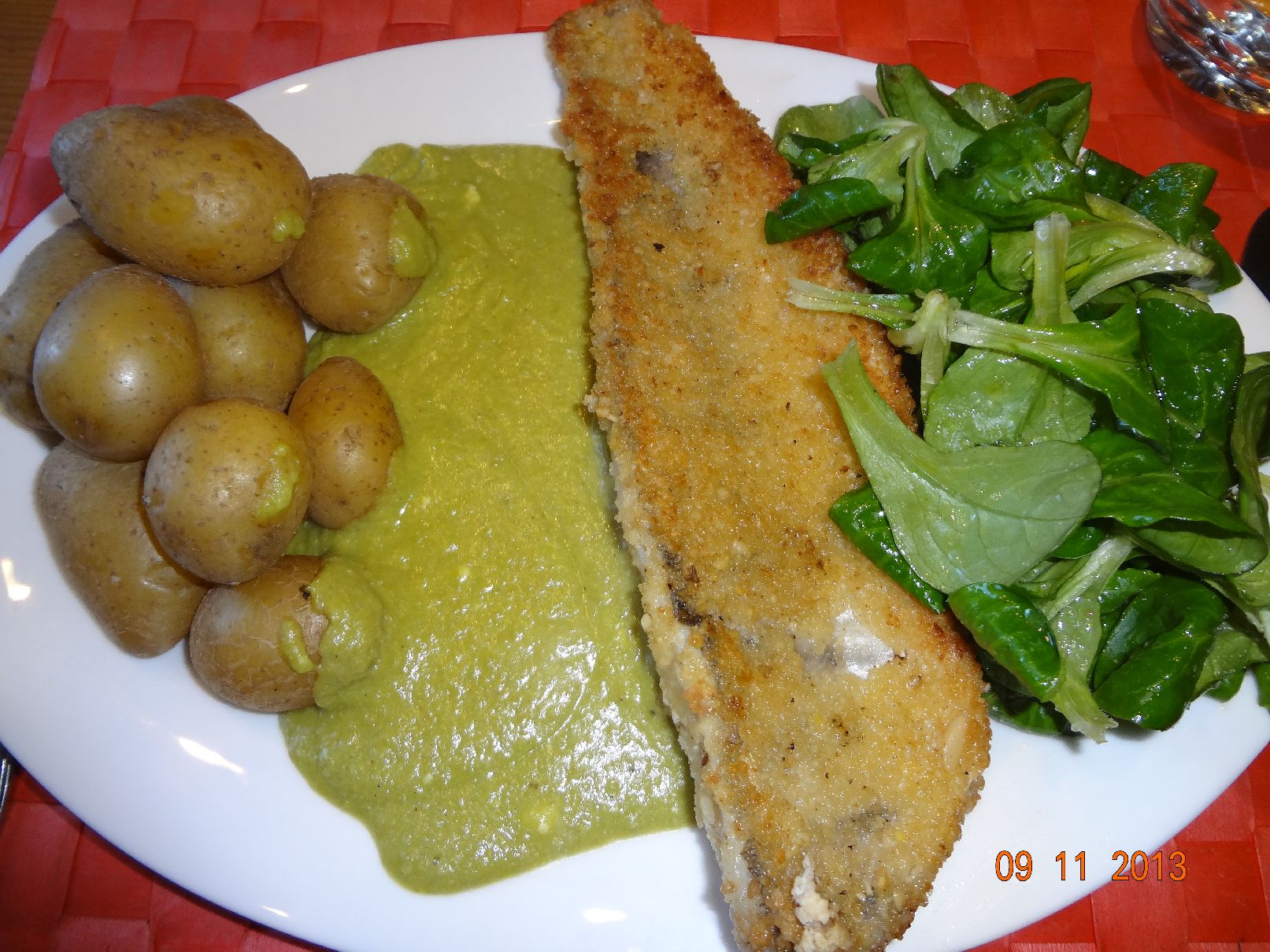 | Zander-Filet im Pinien-Panko-Mantel mit Erbsen-Püree und sehr feinen Kartoffeln |