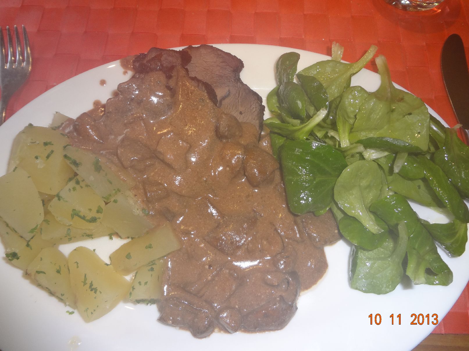 | Rinder-Braten mit Pilzen in Rotwein-Soße und Rosmarin-Kartoffeln |