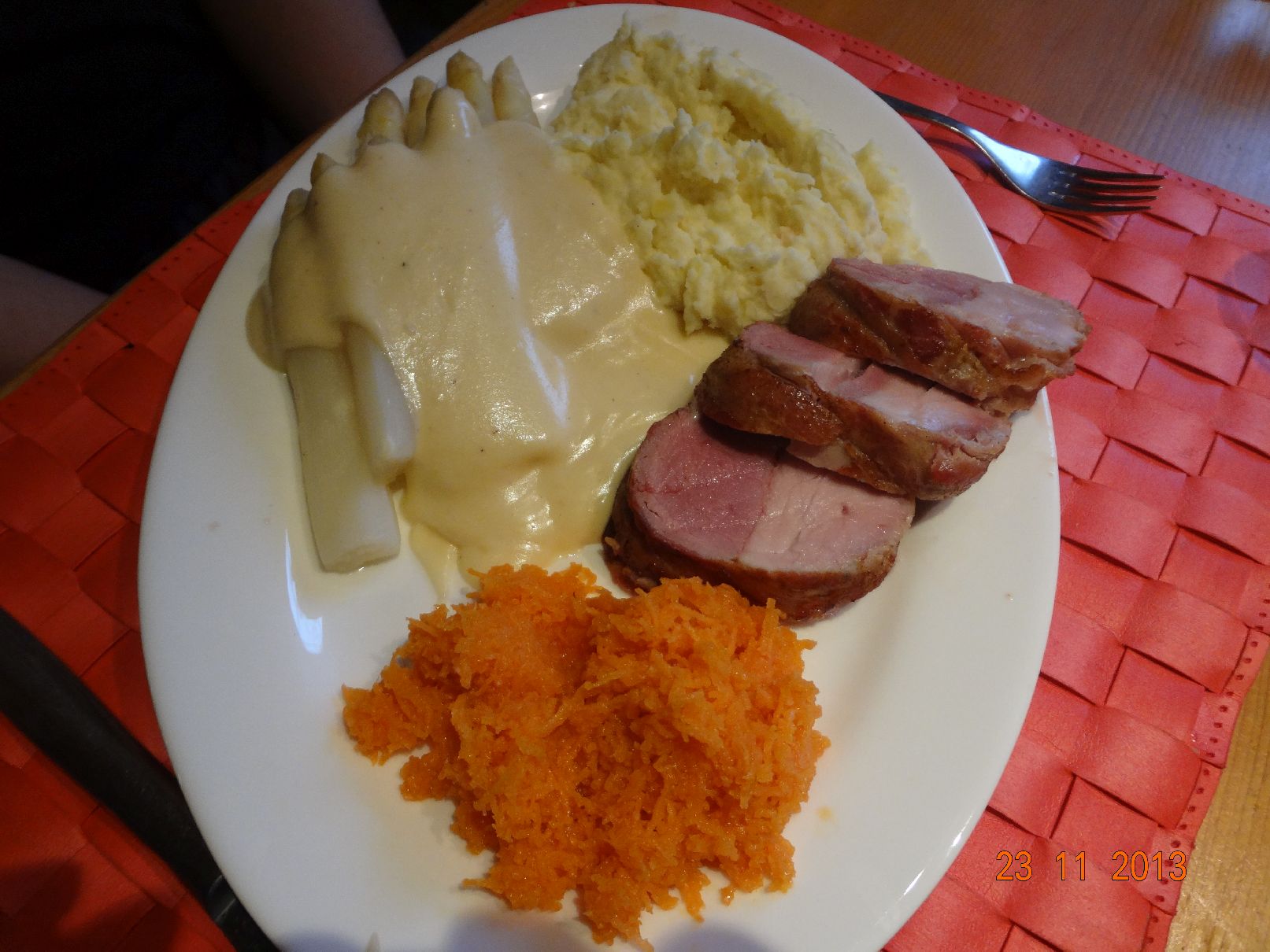 | Schweine-Filet im Speck-Mantel mit Spargel in Käse-Soße |