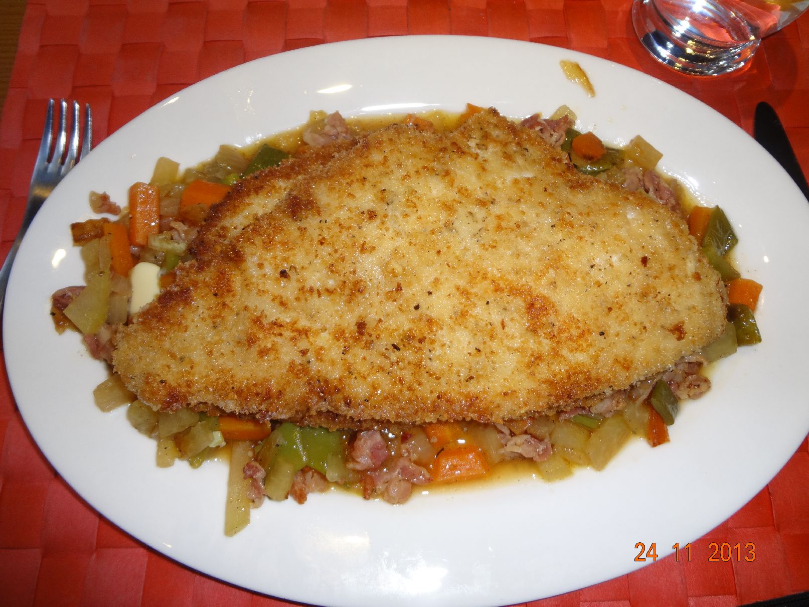 | Paniertes Schollen-Filet auf Gemüse-Bett |
