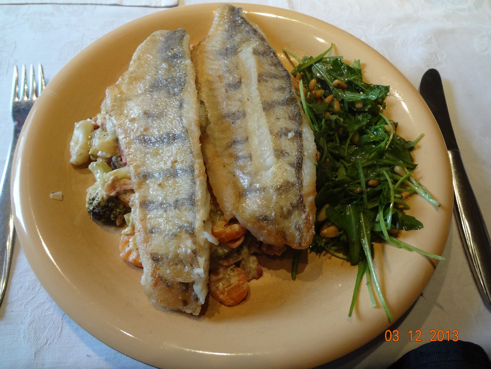 Gebratenes Zander-Filet auf gebratenem Gemüse-Bett und Rucola-Salat |