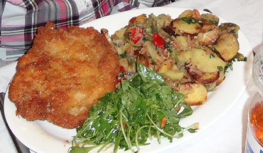 | Hähnchen-Schnitzel mit Kiwi-Gemüse-Bratkartoffeln und Rucola-Salat |