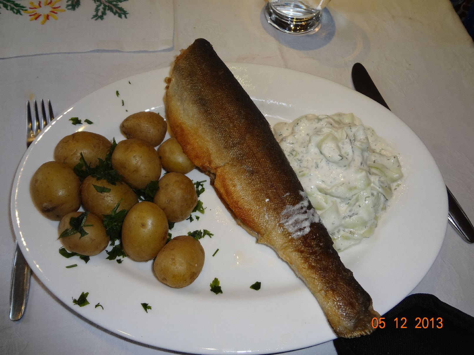 | Forelle Müllerin, Petersilien-Kartoffeln und Gurken-Salat |