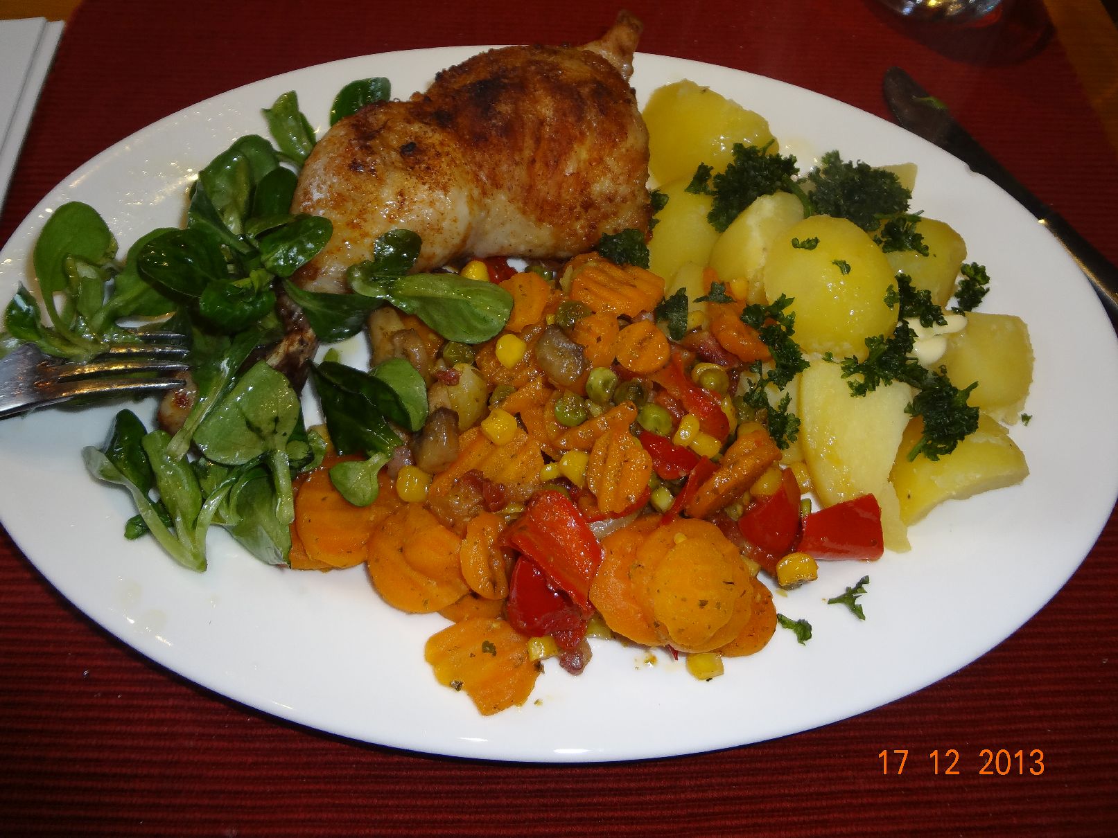 | Hähnchen-Keule mit französischem Gemüse und Rauchsalz-Kartoffeln |