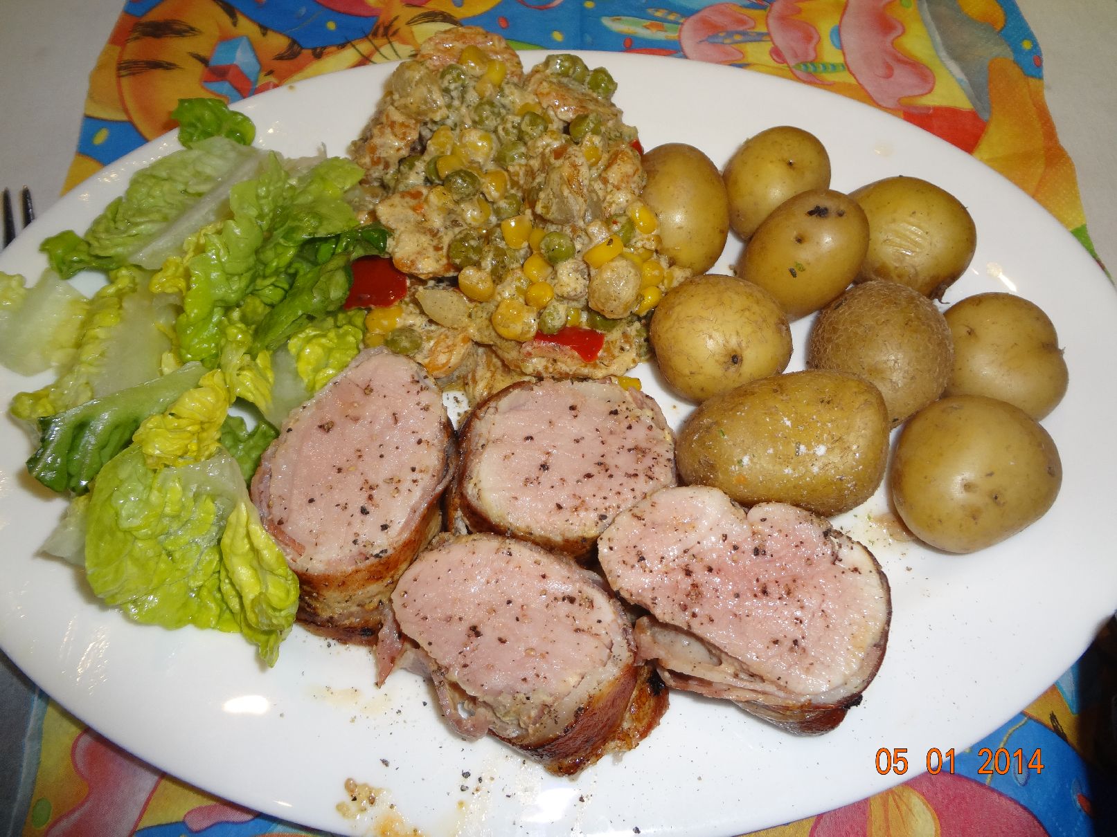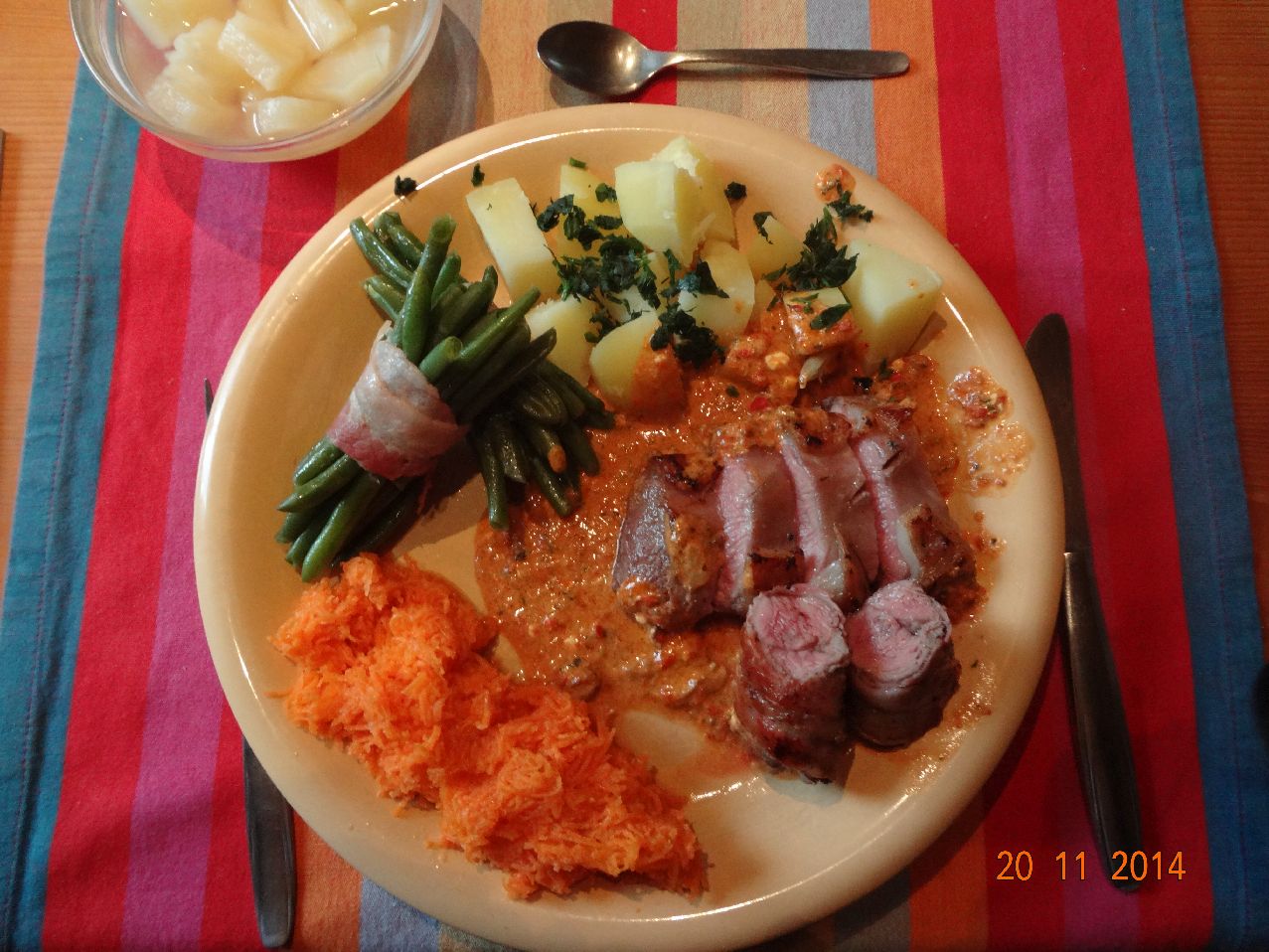| Schweine-Filet im Speck-Mantel in der Röhre, Möhren-Gemüse, Petersilien-Kartoffeln und Gurken-Salat |