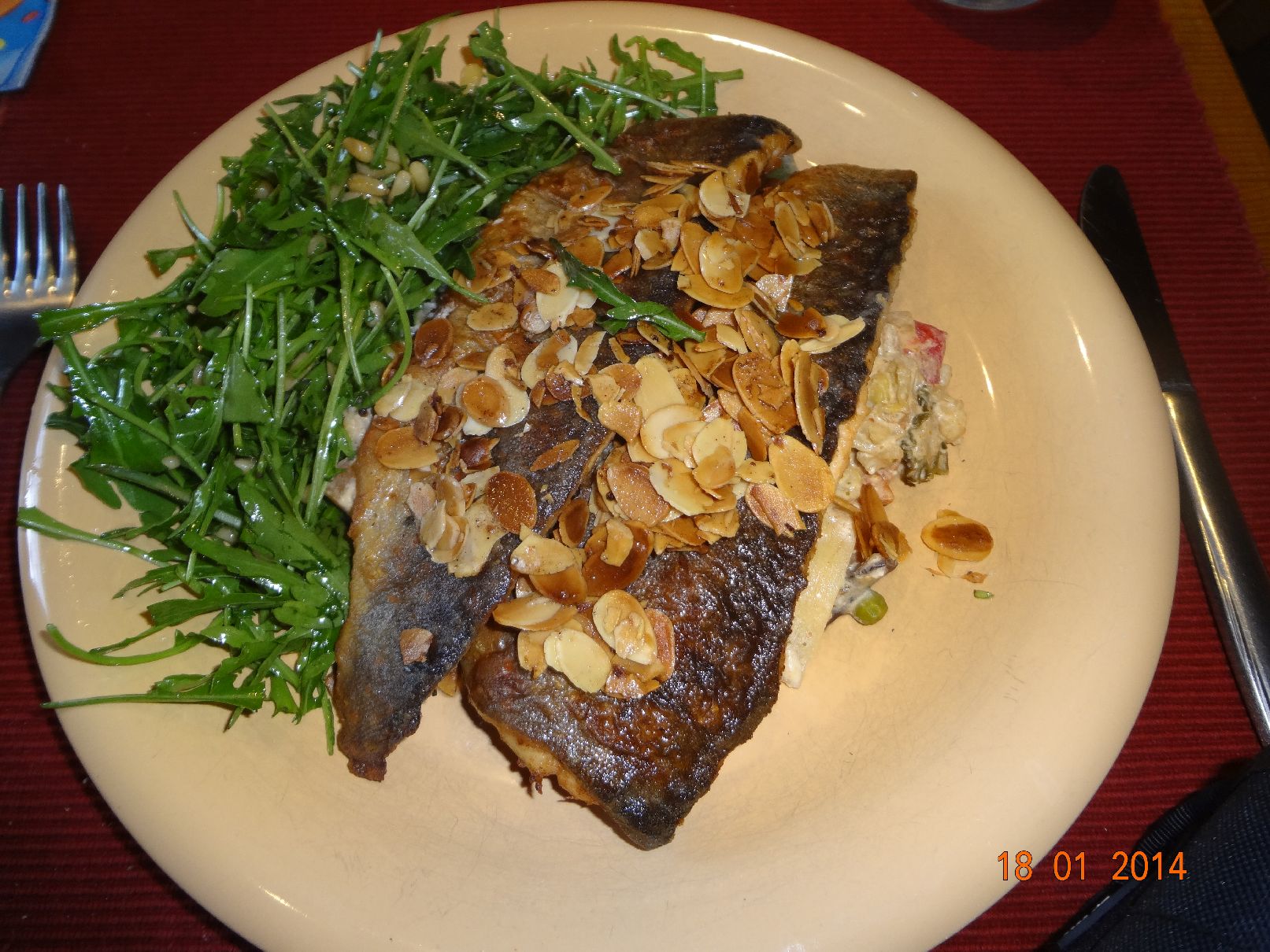 | Forelle Müllerin mit Mandel-Splittern, Asia-Gemüse und Rucola-Salat mit Pinien-Kernen |