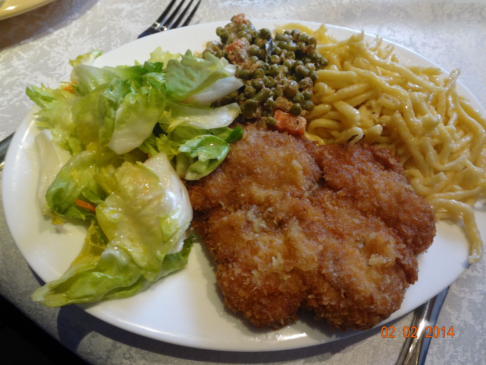 Hähnchen-Schnitzel, selbstgemachte Spätzle und Endivien-Möhren-Salat |