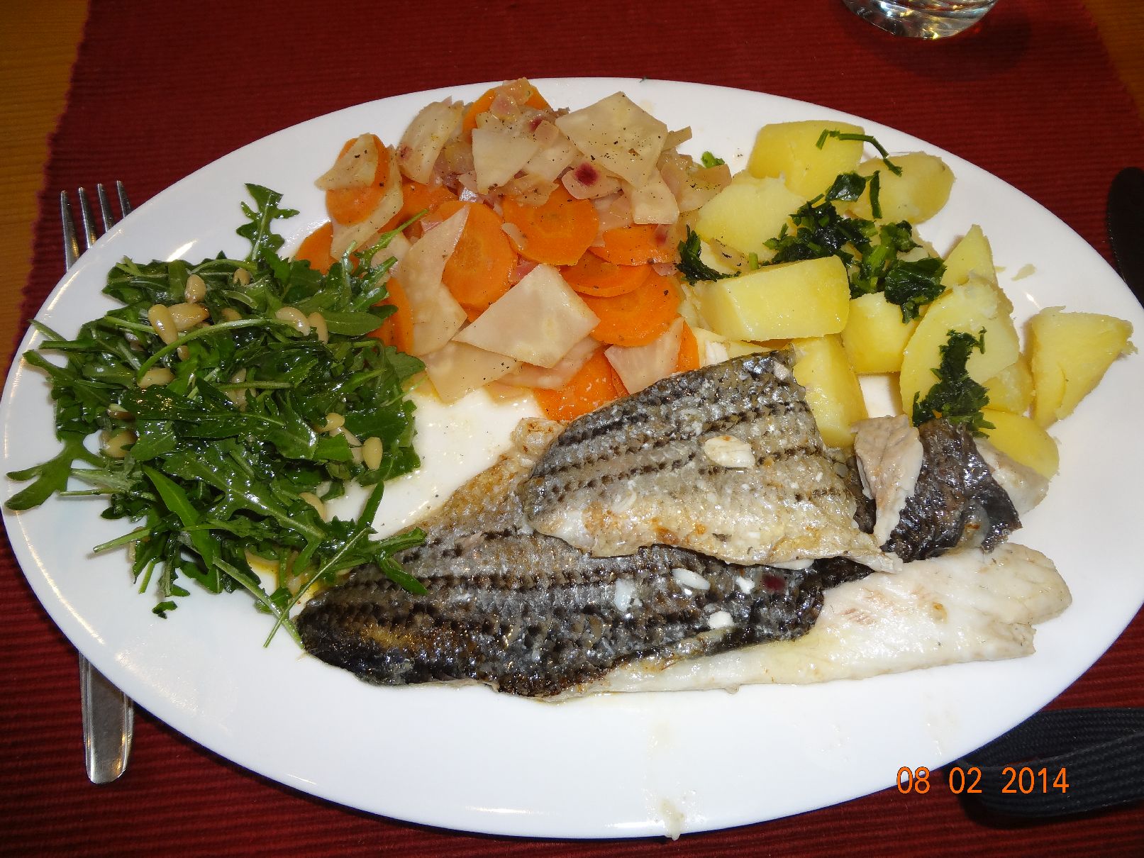 | Vanille-Karotten-Sellerie-Gemüse, Streifenbarsch-Filet, Rosmarin-Kartoffeln und Rucola-Salat mit Pinien-Kernen |