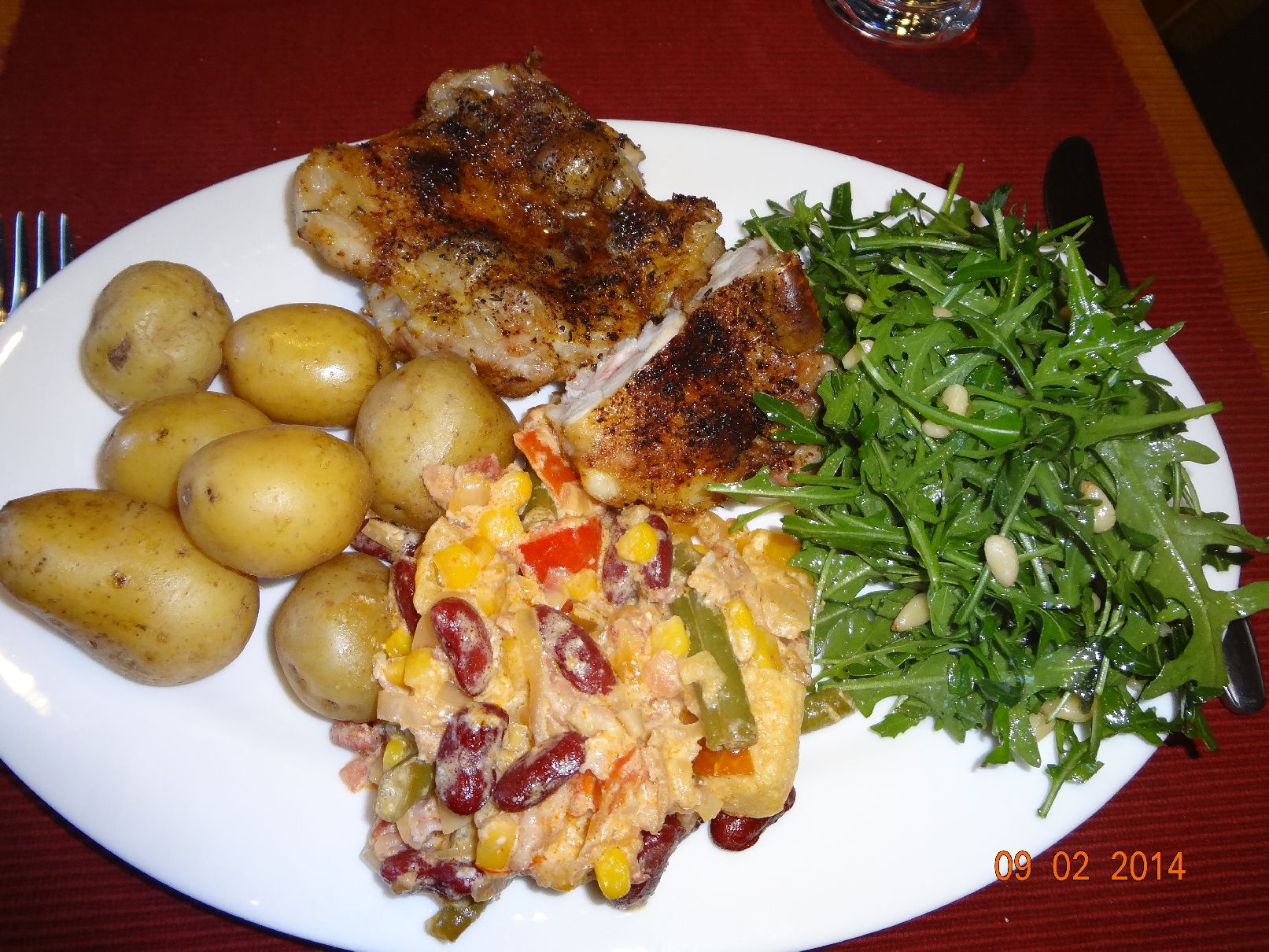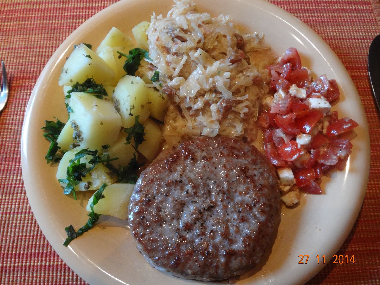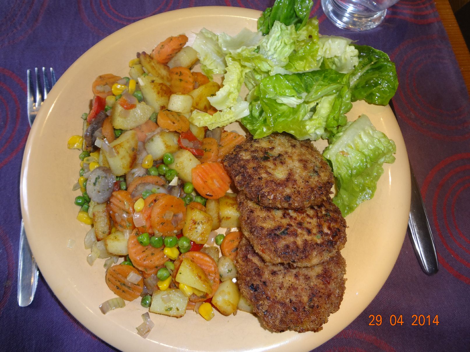 | Frikadellen mit Gemüse-Brat-Kartoffeln und Salat |